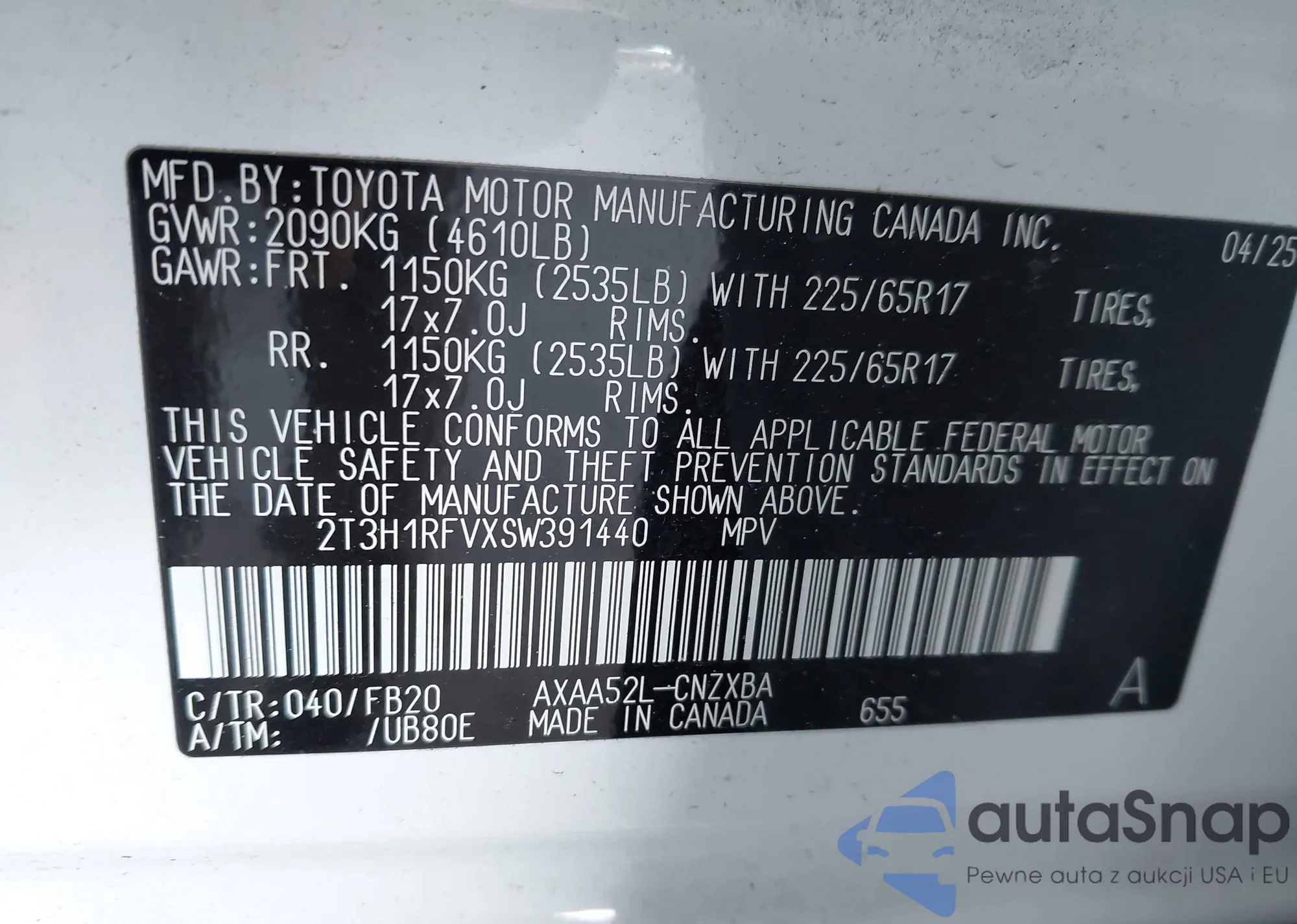 • VIN 2T3H1RFVXSW391440