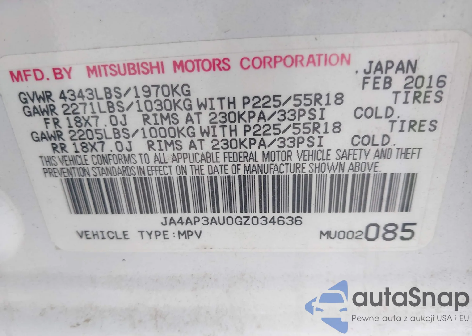 LOT: 43280974 VIN: JA4AP3AU0GZ034636