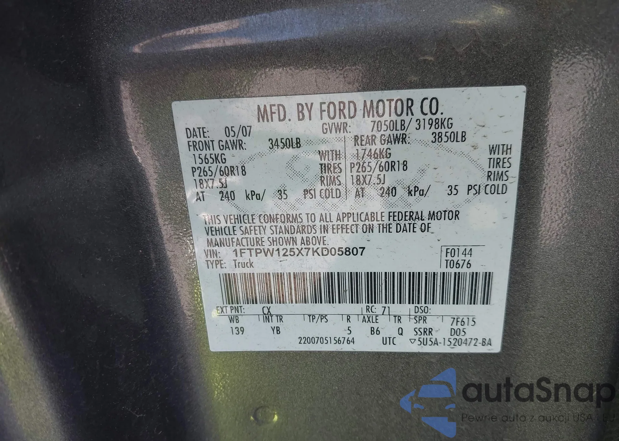 • VIN 1FTPW125X7KD05807