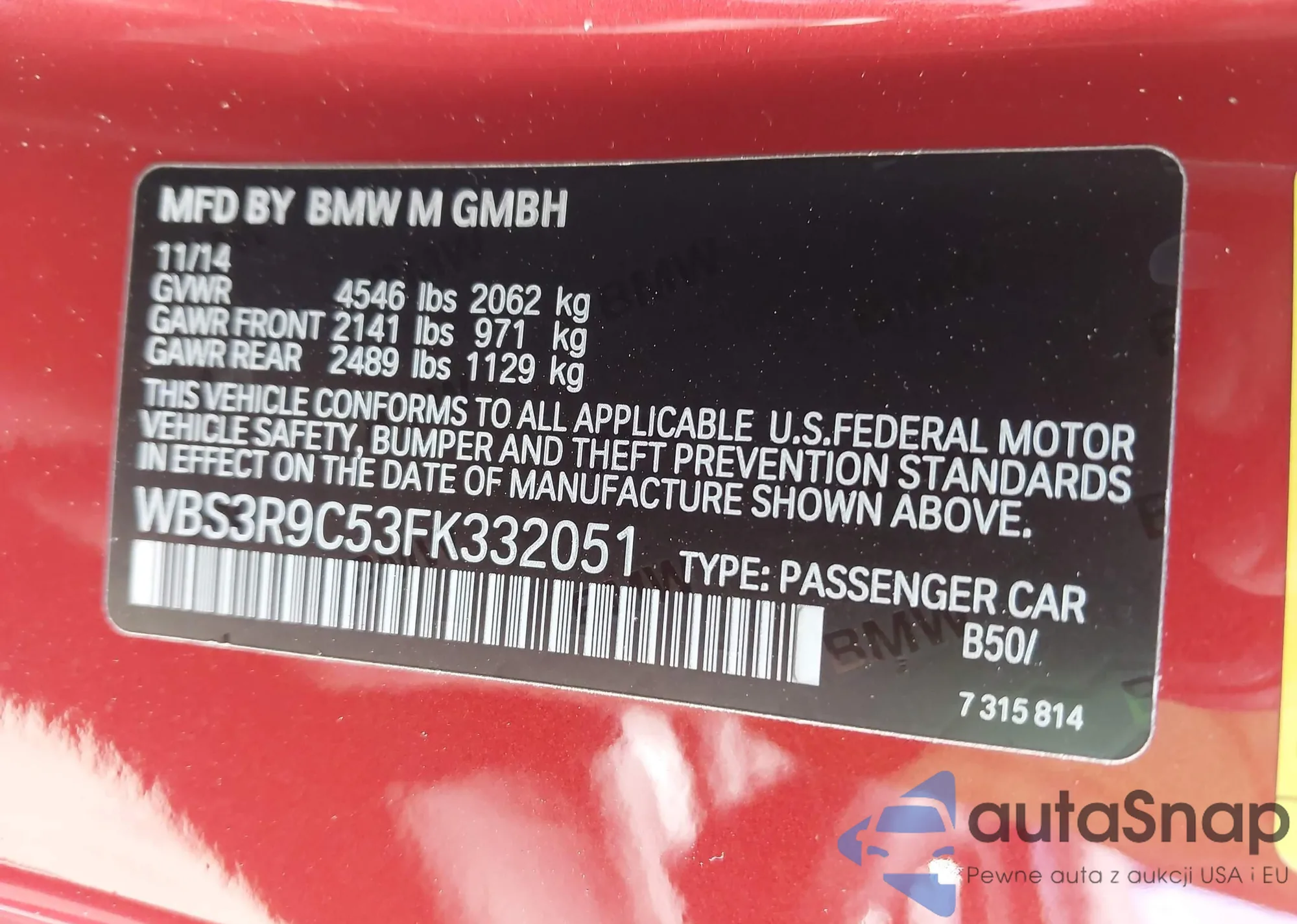2015 BMW M4 z USA, uszkodzony, nr VIN WBS3R9C53FK332051