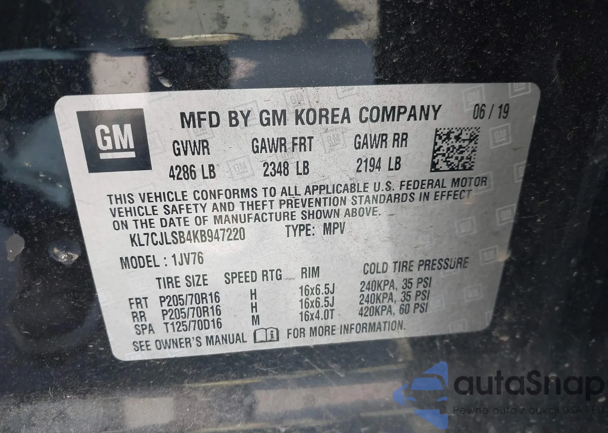 • VIN KL7CJLSB4KB947220