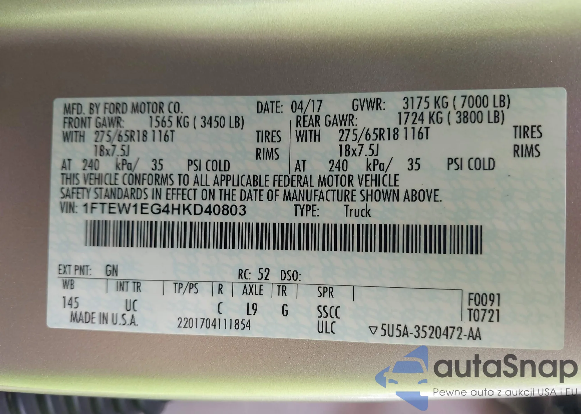 LOT: 43322252 VIN: 1FTEW1EG4HKD40803