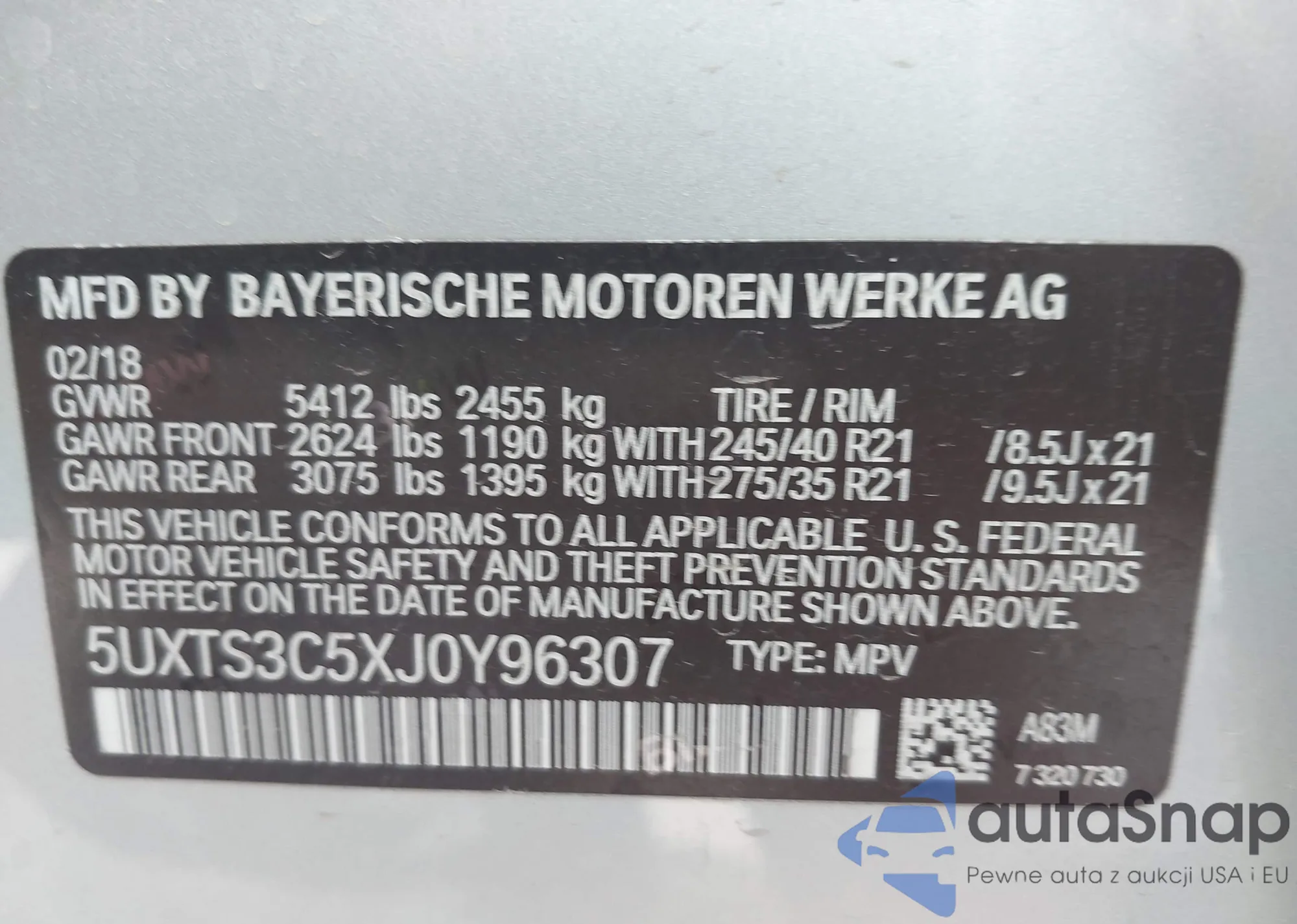 • VIN 5UXTS3C5XJ0Y96307
