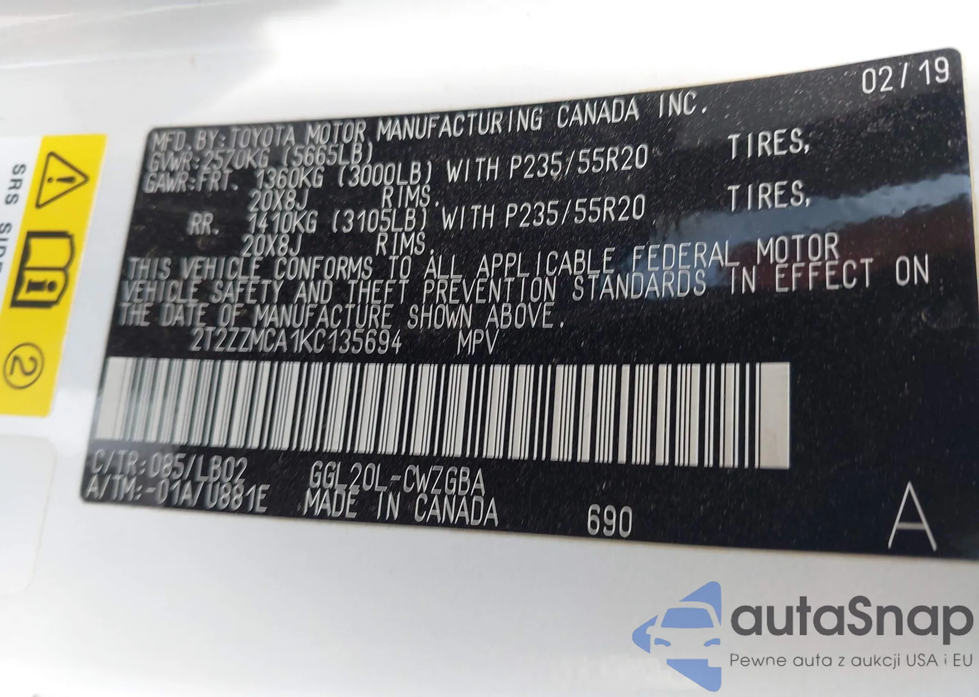 • VIN 2T2ZZMCA1KC135694