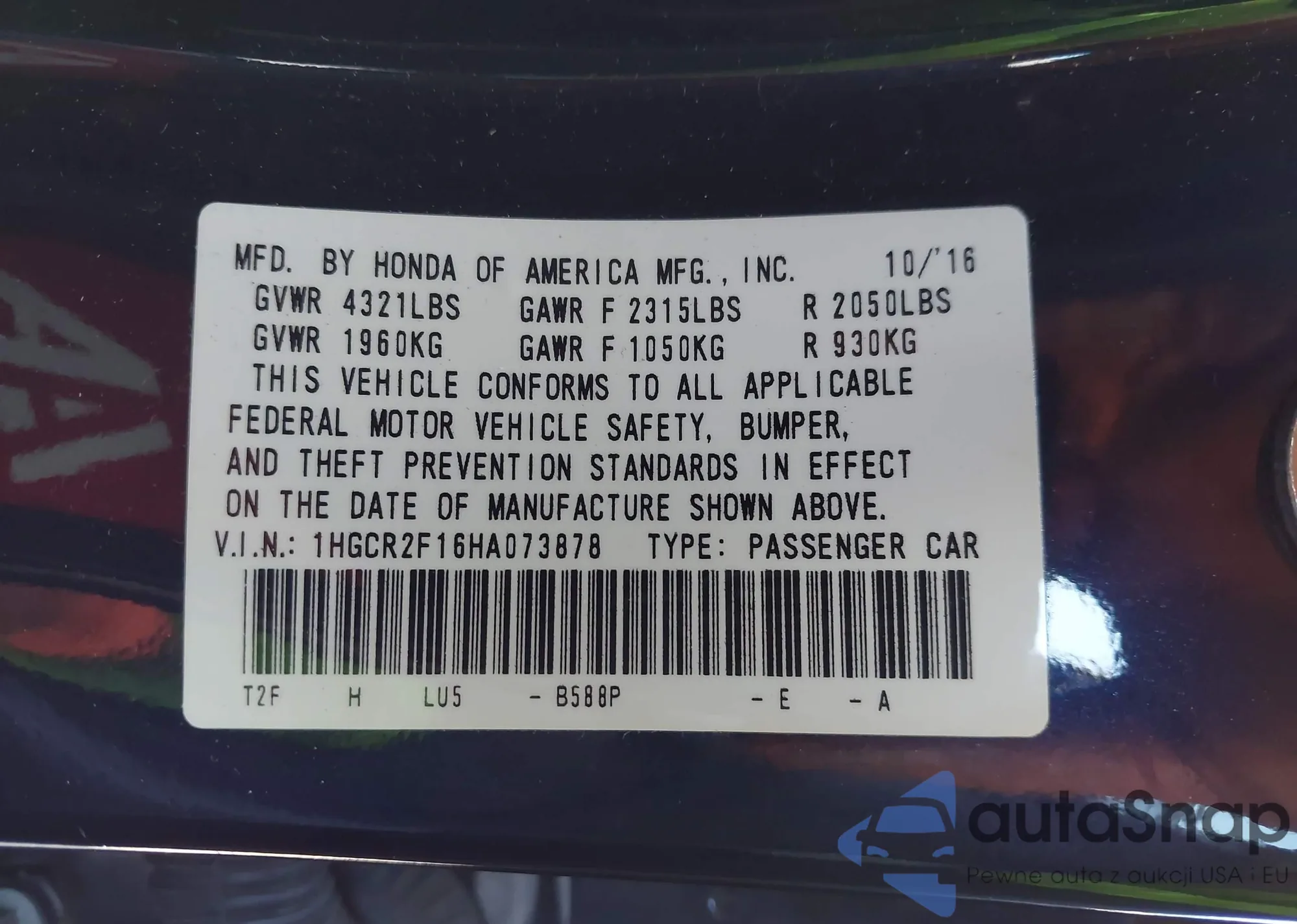 LOT: 43322982 VIN: 1HGCR2F16HA073878