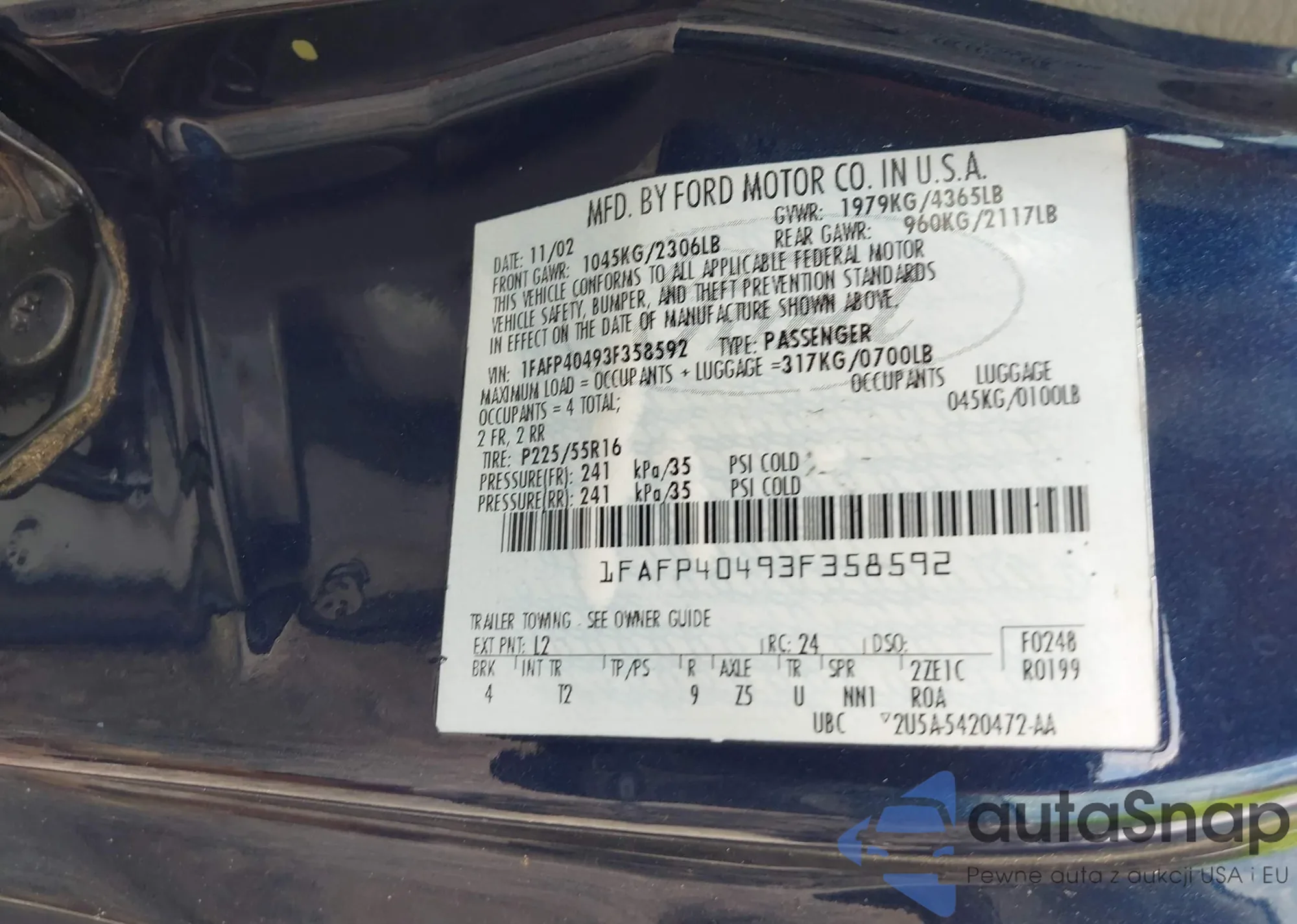 LOT: 43110413 VIN: 1FAFP40493F358592