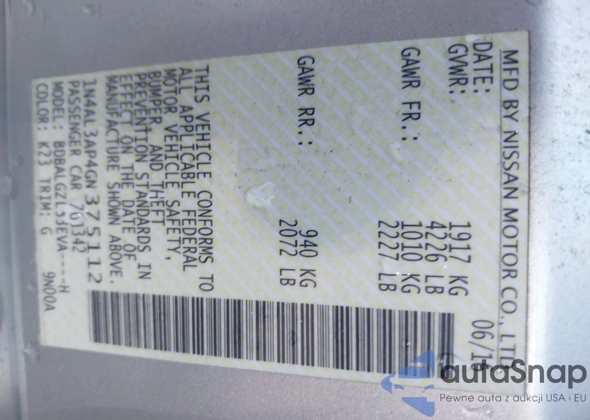 • VIN 1HGCP2F85AA099915