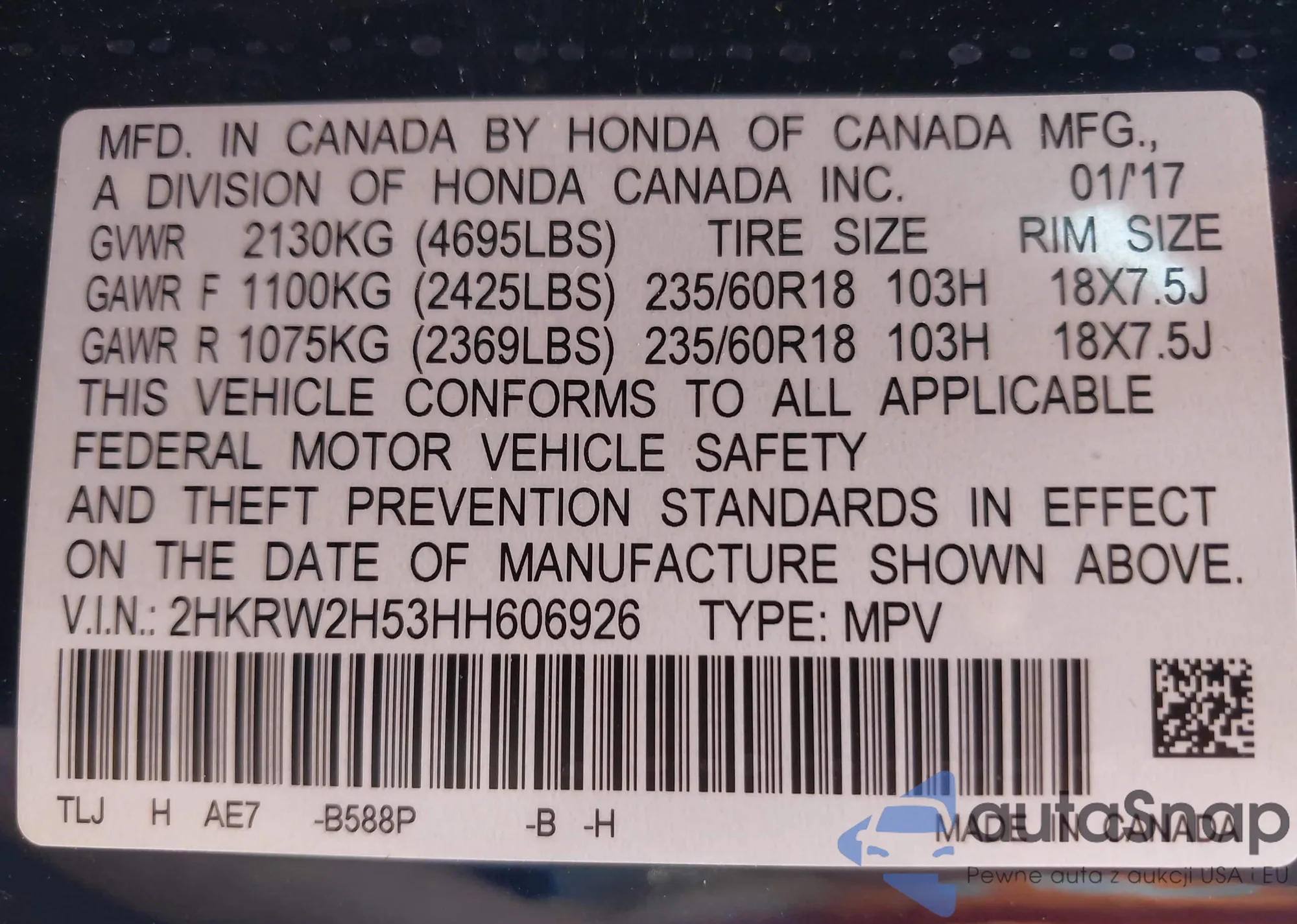• VIN 2HKRW2H53HH606926