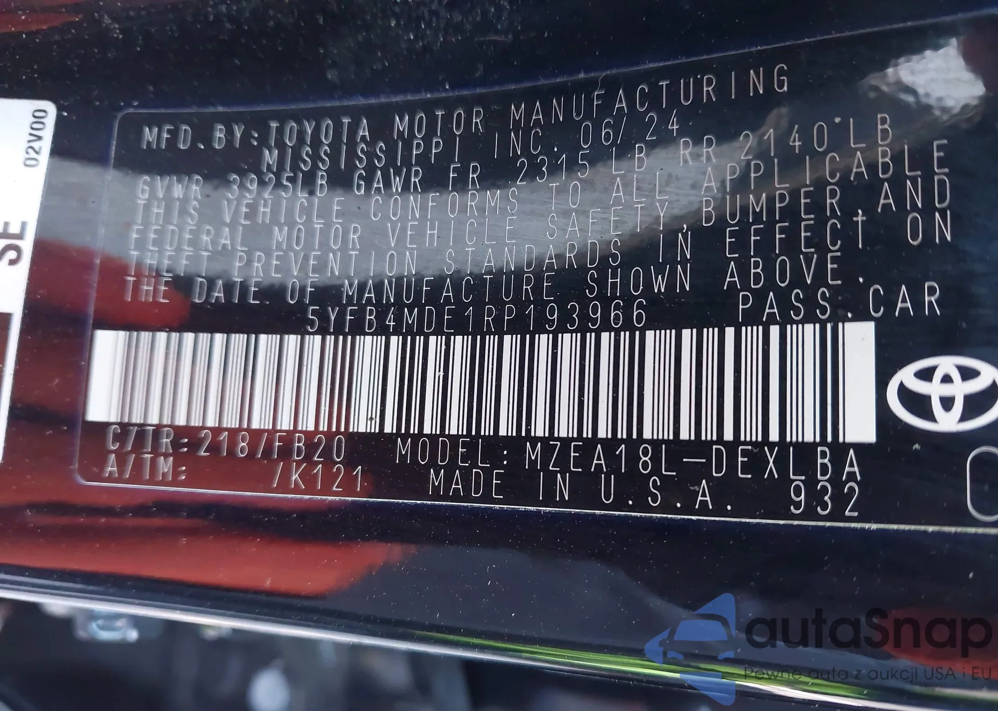 • VIN 5YFB4MDE1RP193966