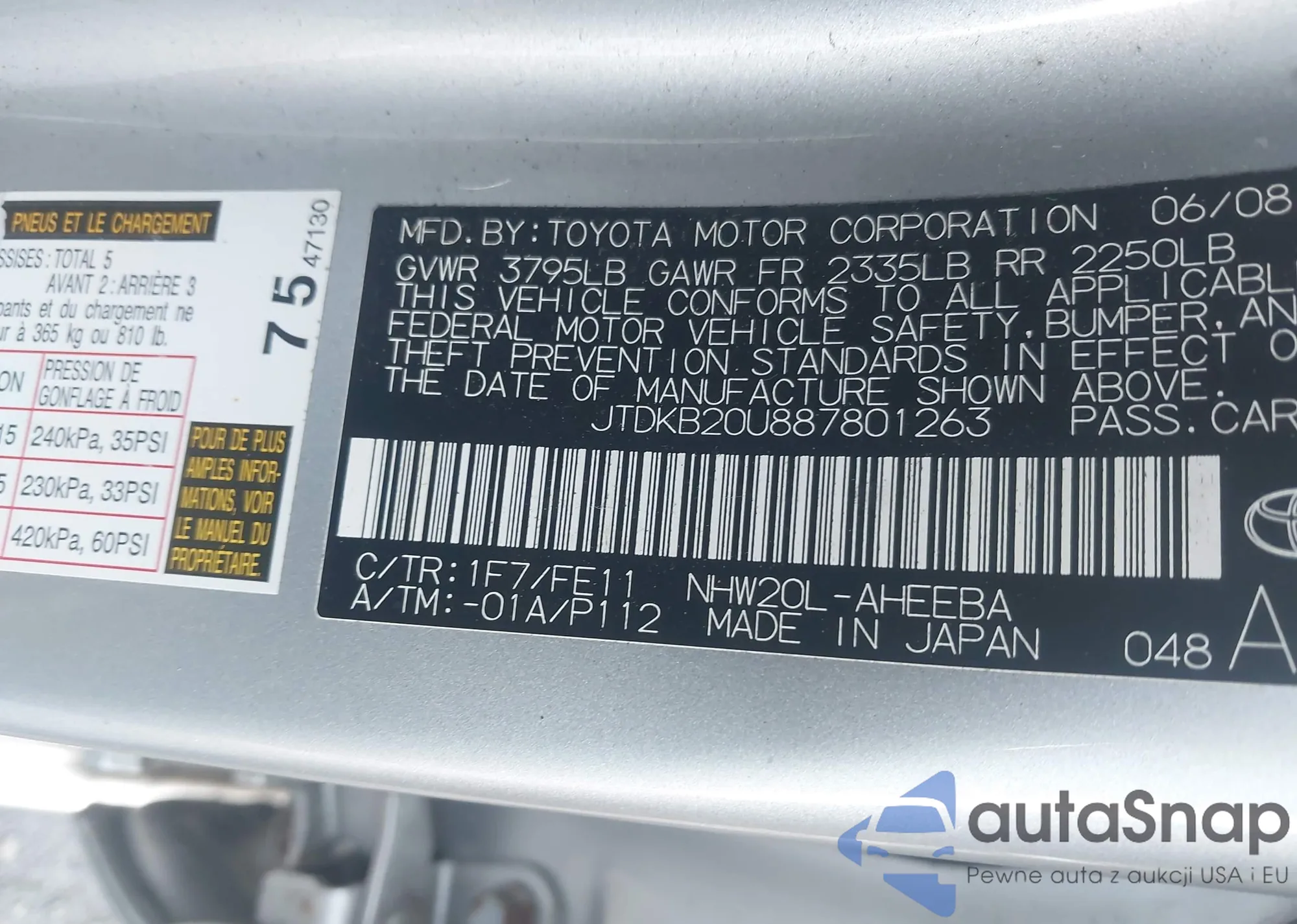LOT: 43297194 VIN: JTDKB20U887801263