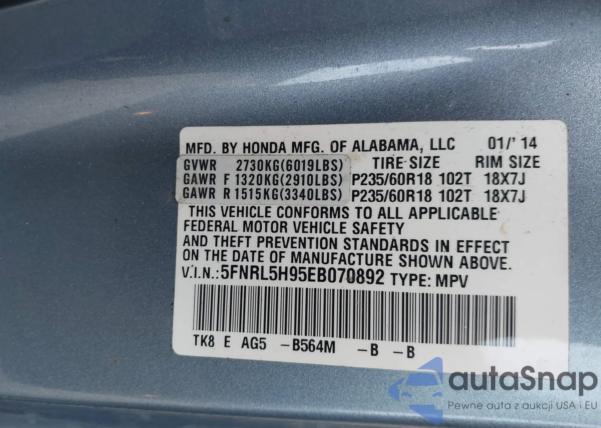 • VIN 5FNRL5H95EB070892