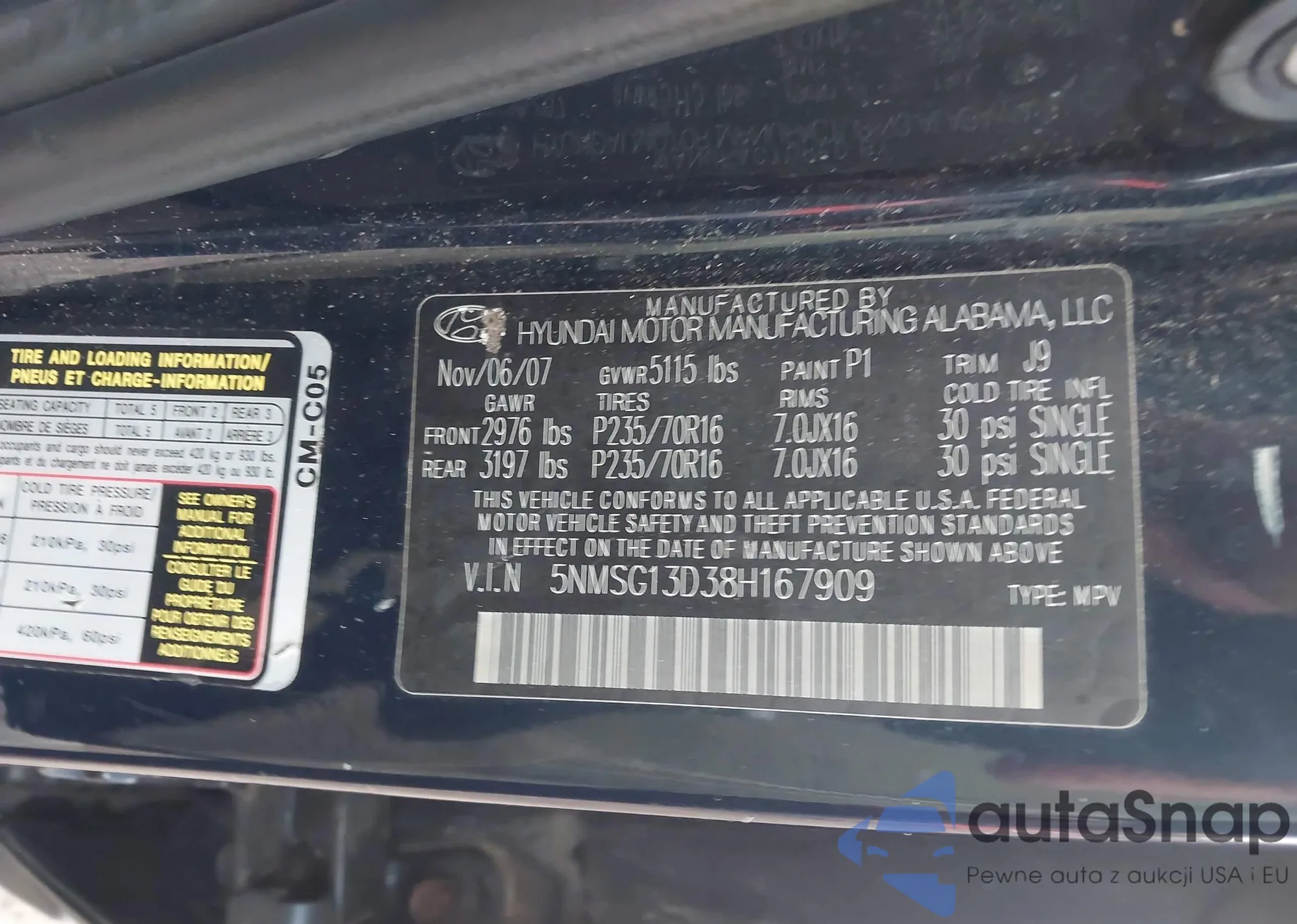 • VIN 5NMSG13D38H167909