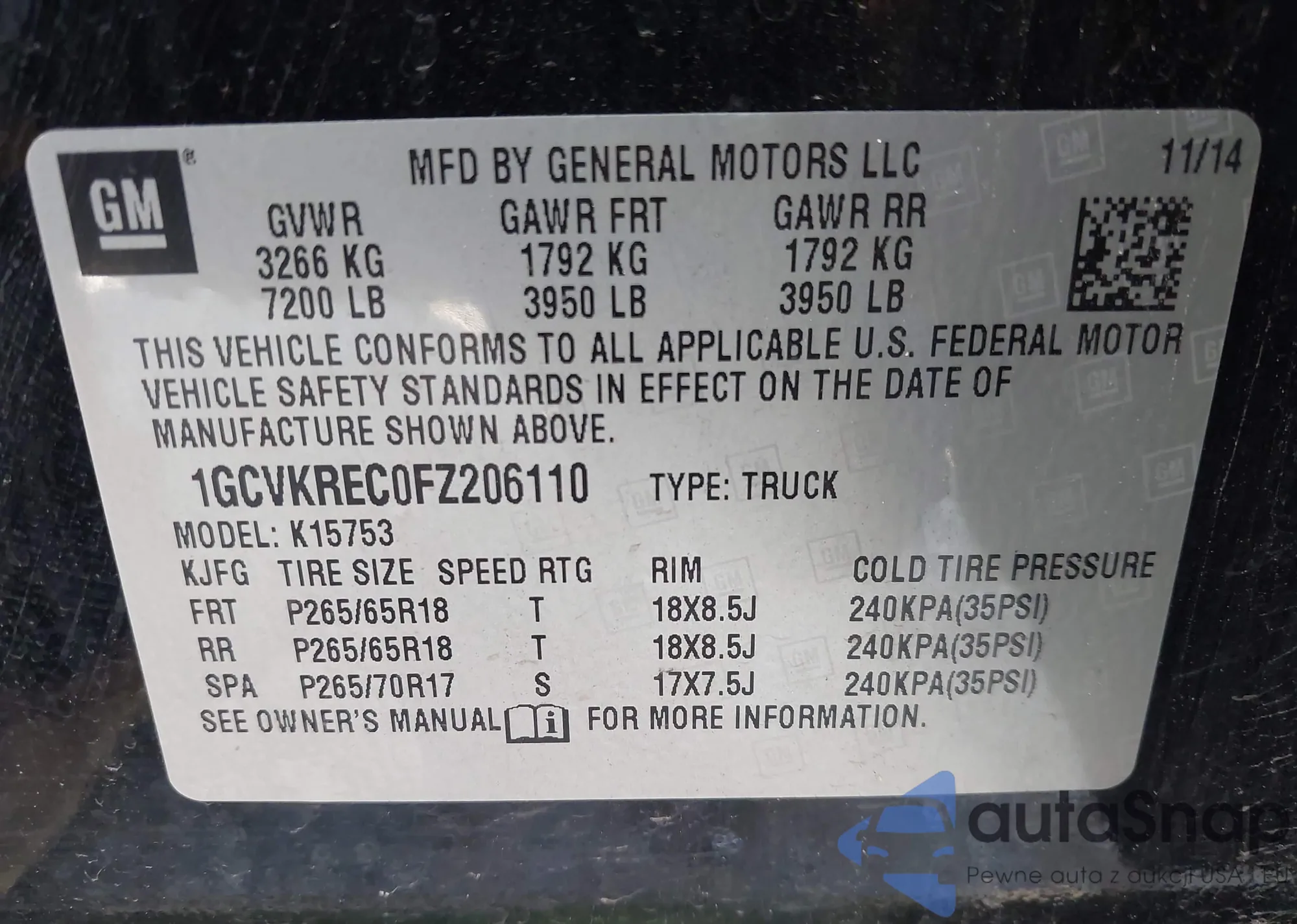 LOT: 42695259 VIN: 1GCVKREC0FZ206110