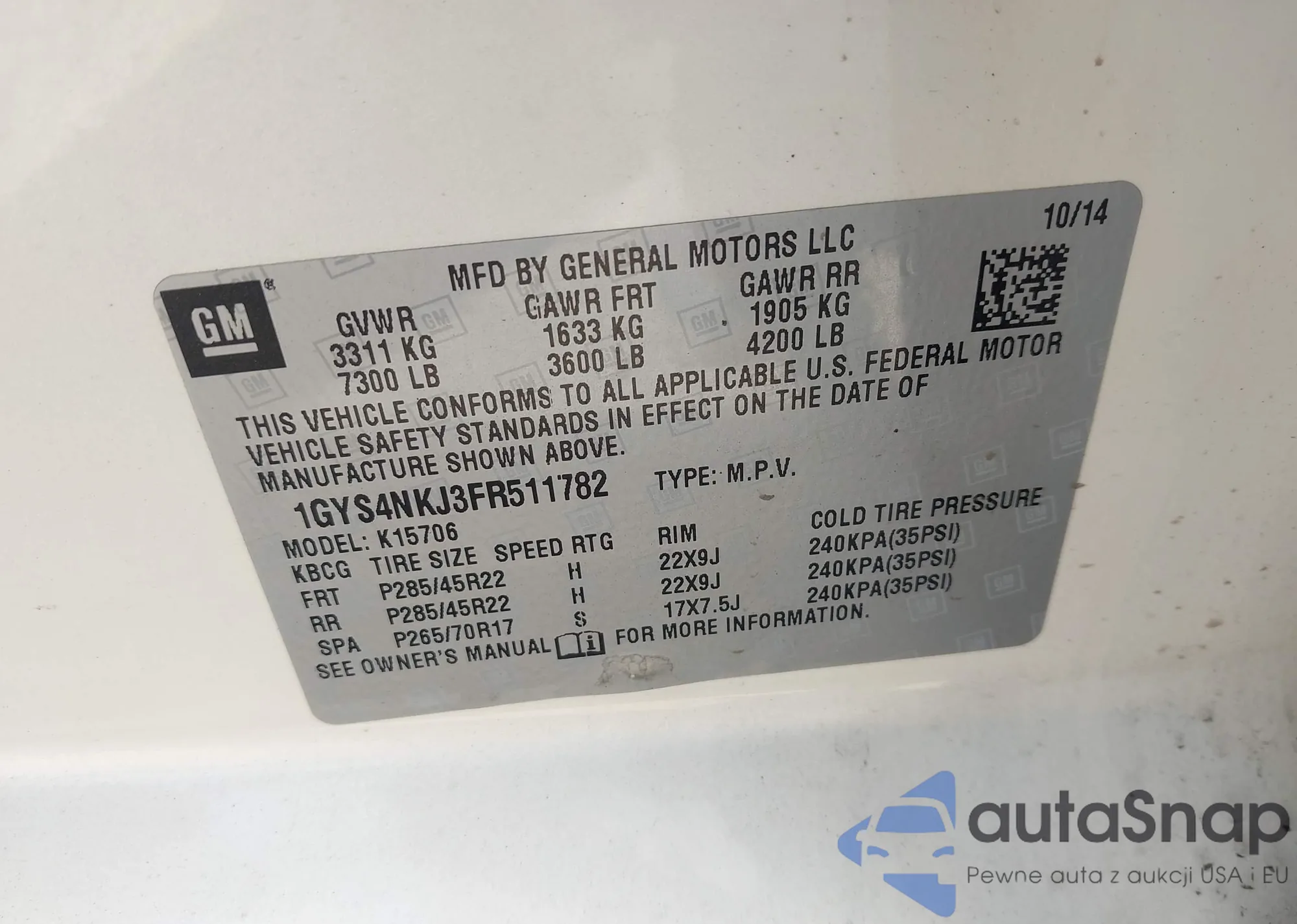 • VIN 1GYS4NKJ3FR511782