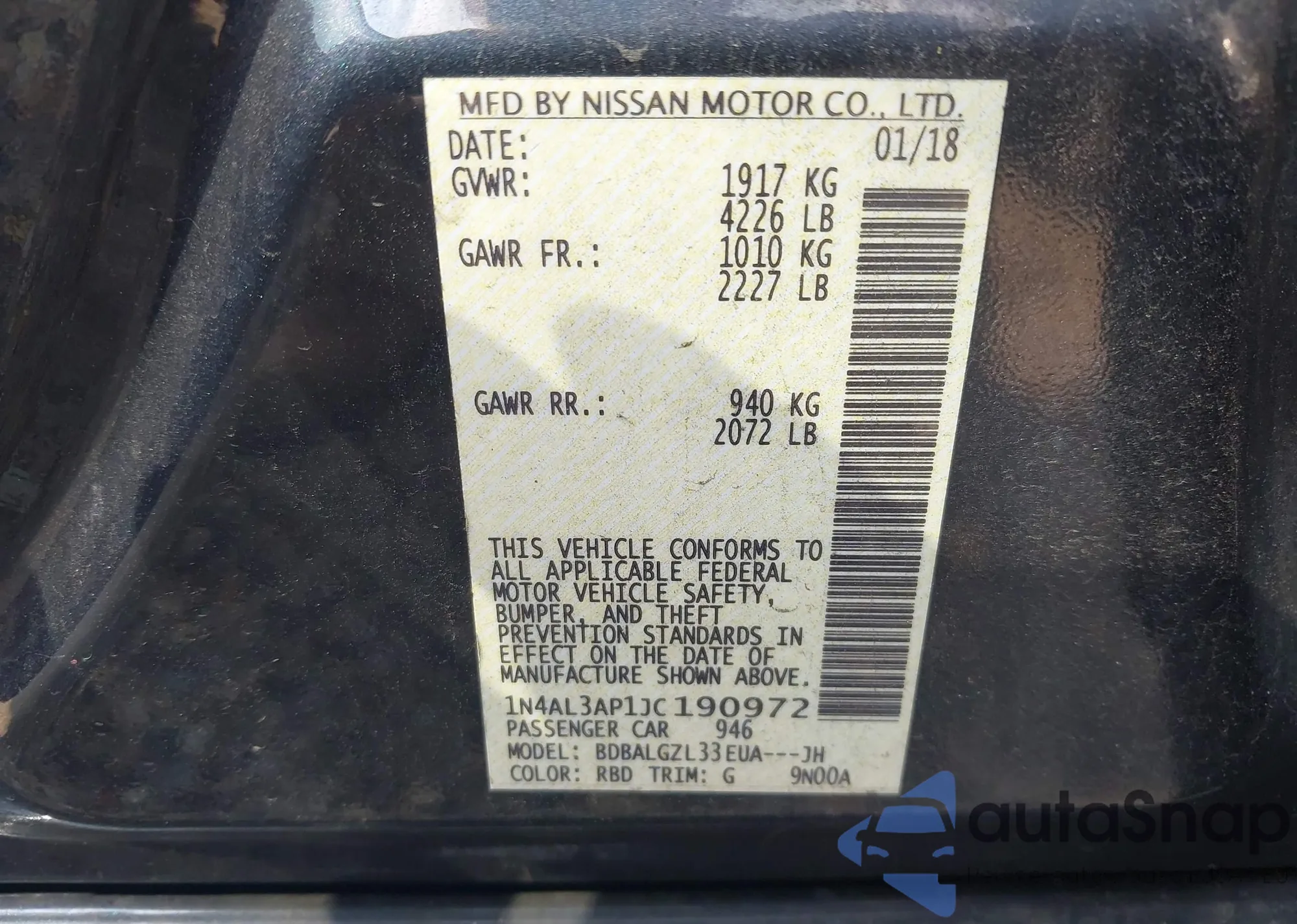 LOT: 42818208 VIN: 1N4AL3AP1JC190972