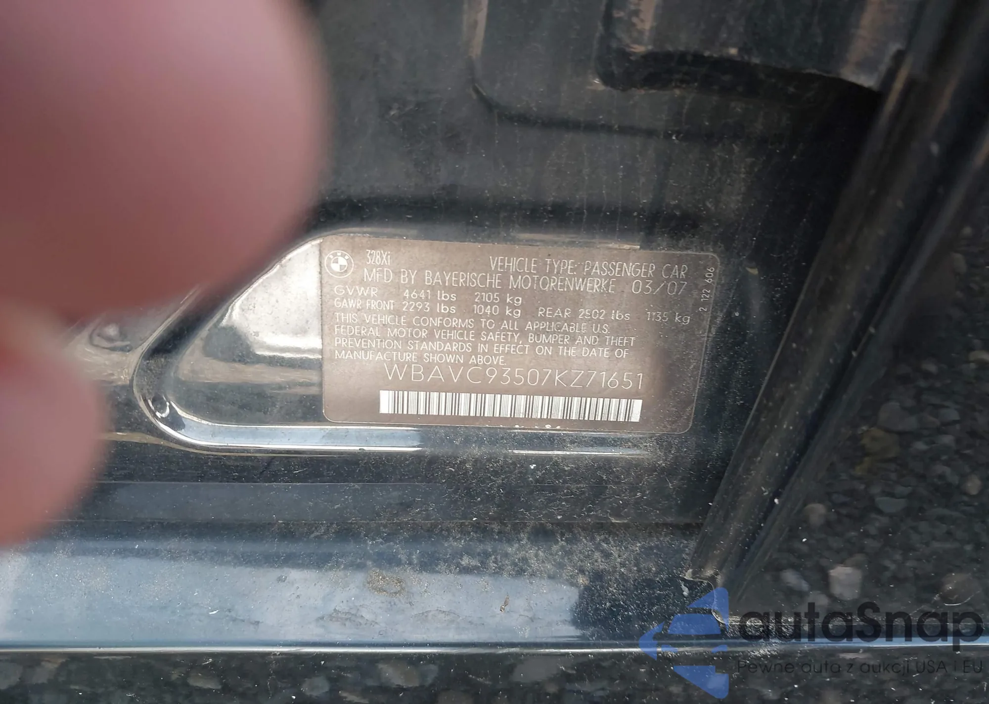 2007 BMW 328Xi z USA, uszkodzony, nr VIN WBAVC93507KZ71651