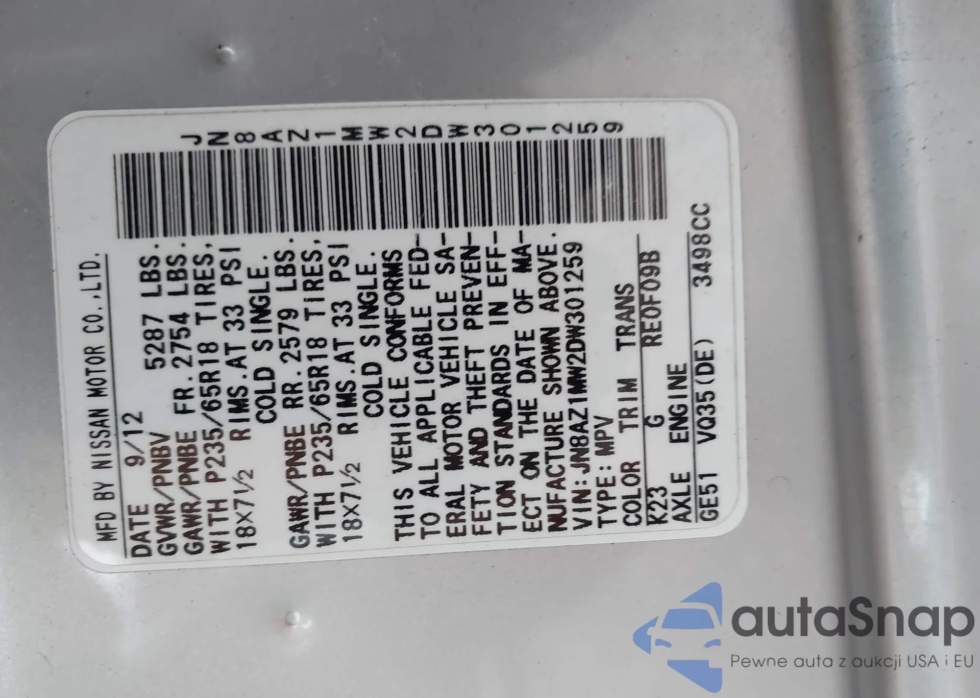 LOT: 43025426 VIN: JN8AZ1MW2DW301259