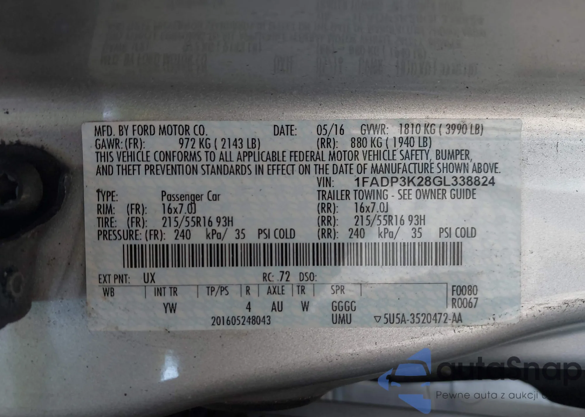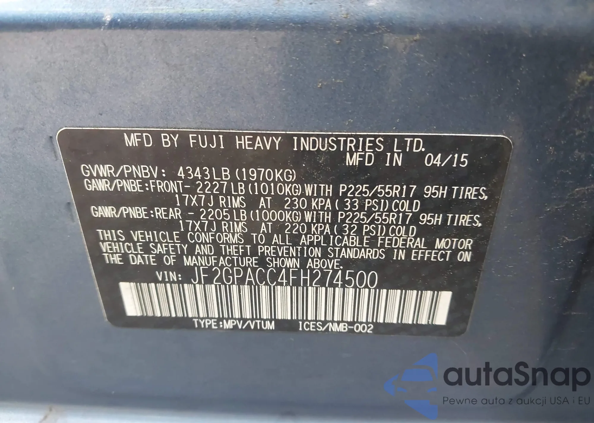 LOT: 43041552 VIN: JF2GPACC4FH274500