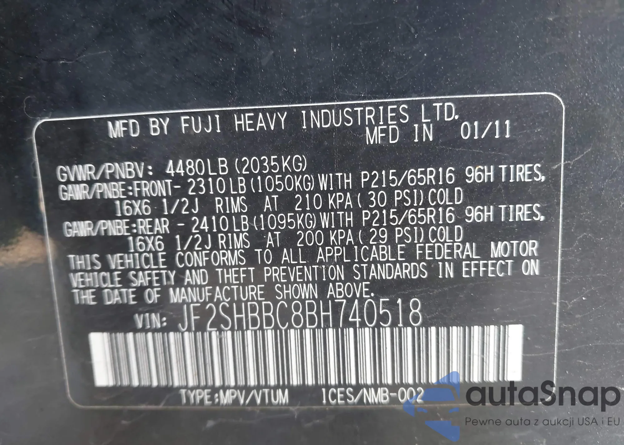 LOT: 43132587 VIN: JF2SHBBC8BH740518