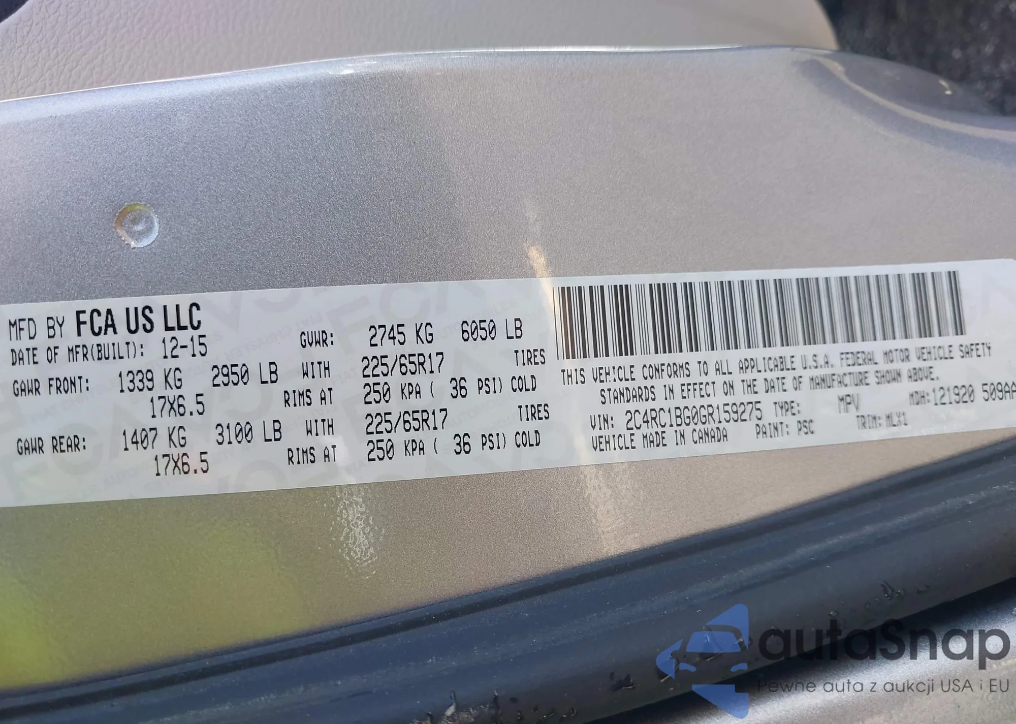 LOT: 42923401 VIN: 2C4RC1BG0GR159275