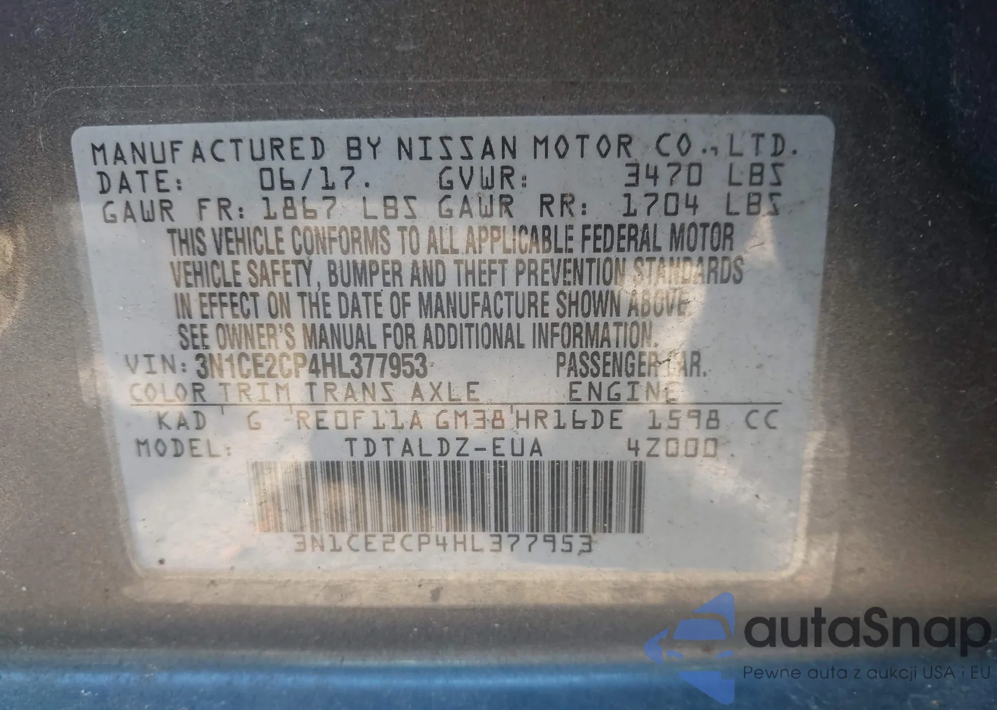• VIN 3N1CE2CP4HL377953