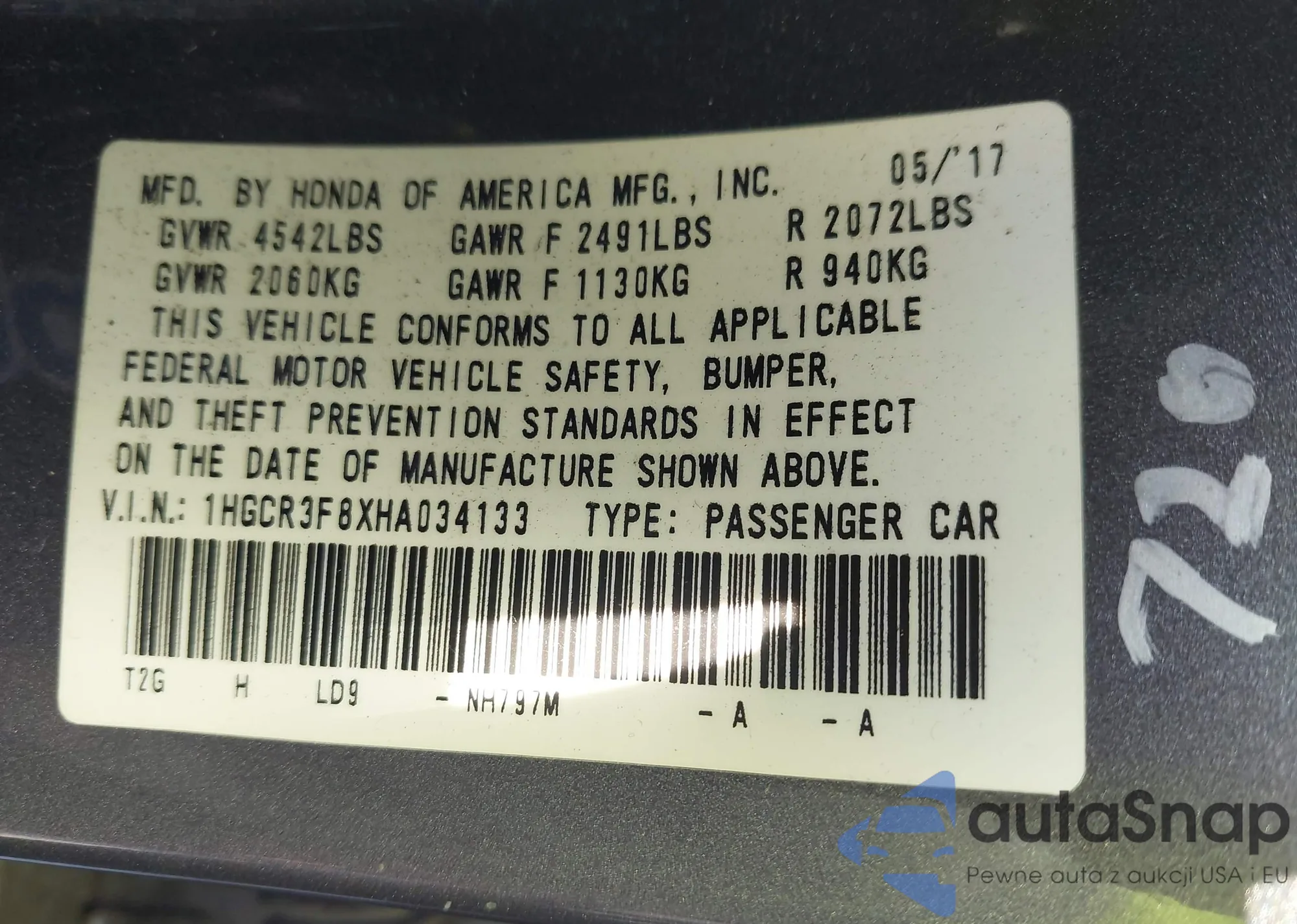 LOT: 43154069 VIN: 1HGCR3F8XHA034133