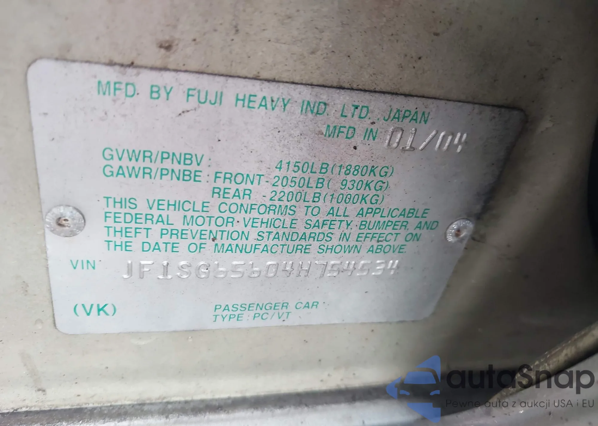 LOT: 43357120 VIN: JF1SG65604H754534
