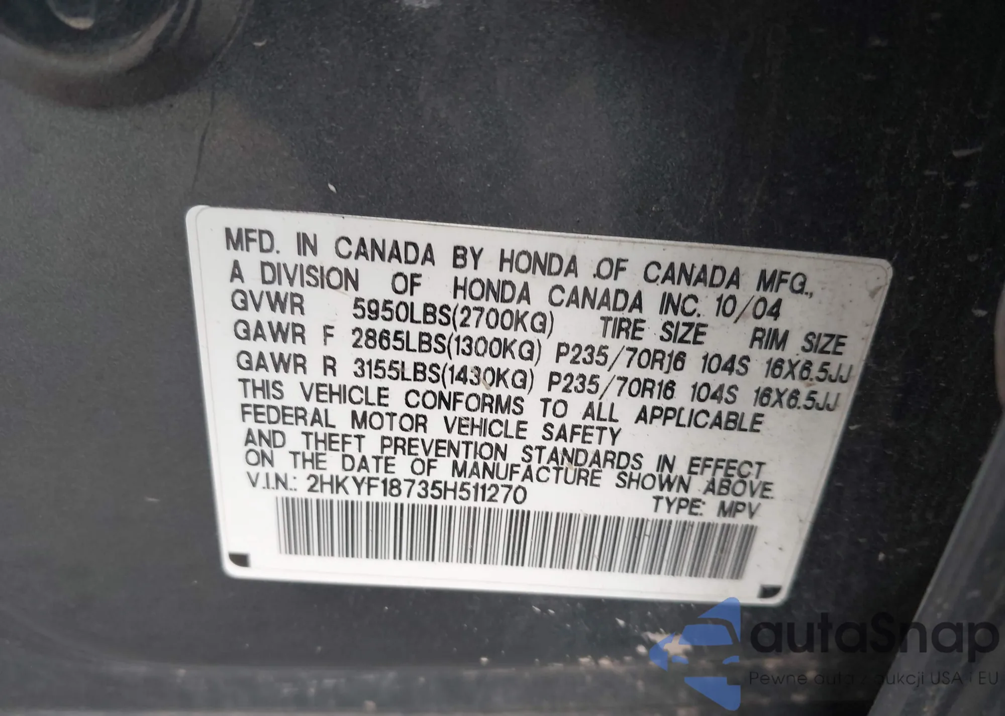 • VIN 2HKRM4H53DH618442