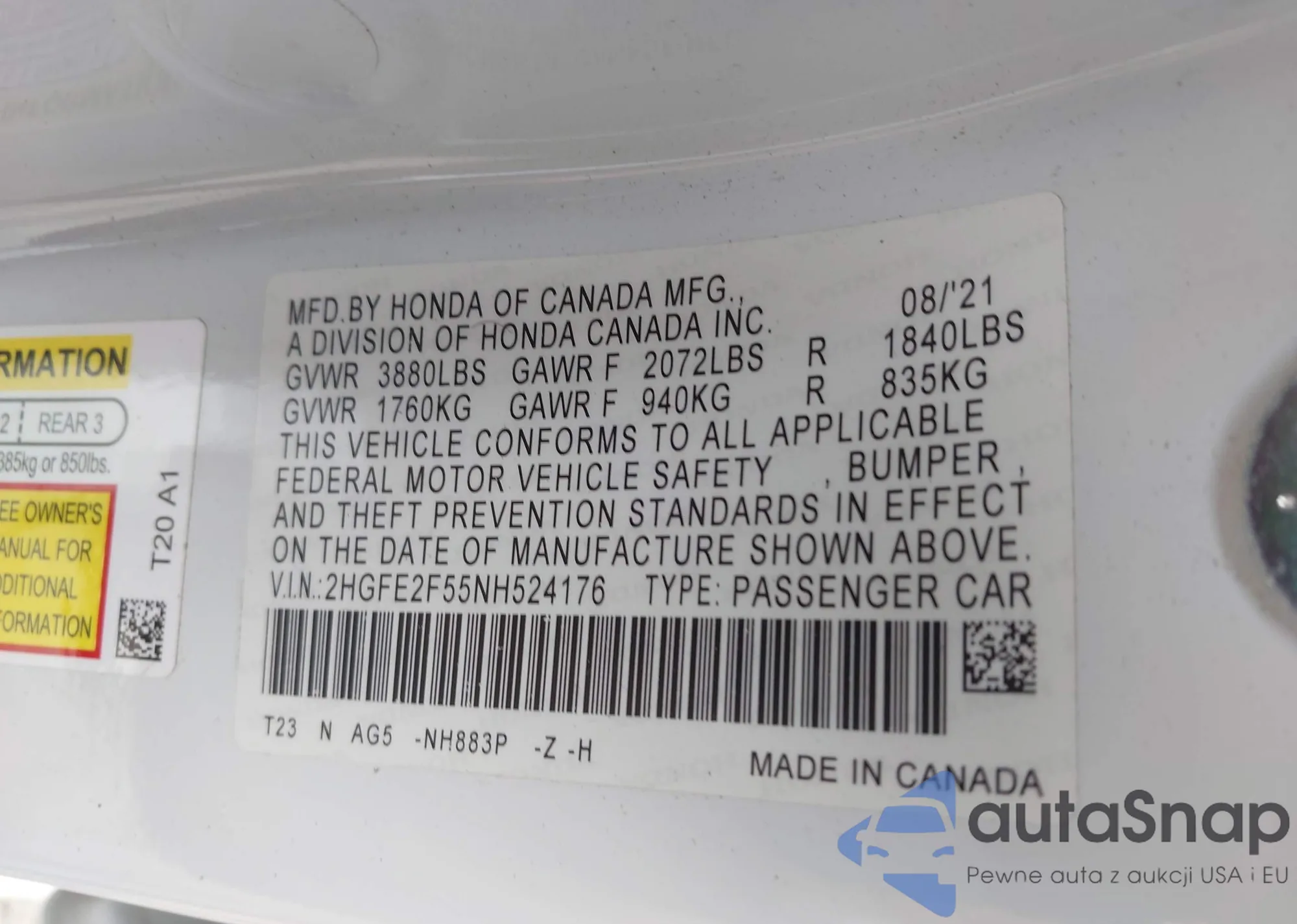• VIN 2HGFE2F55NH524176