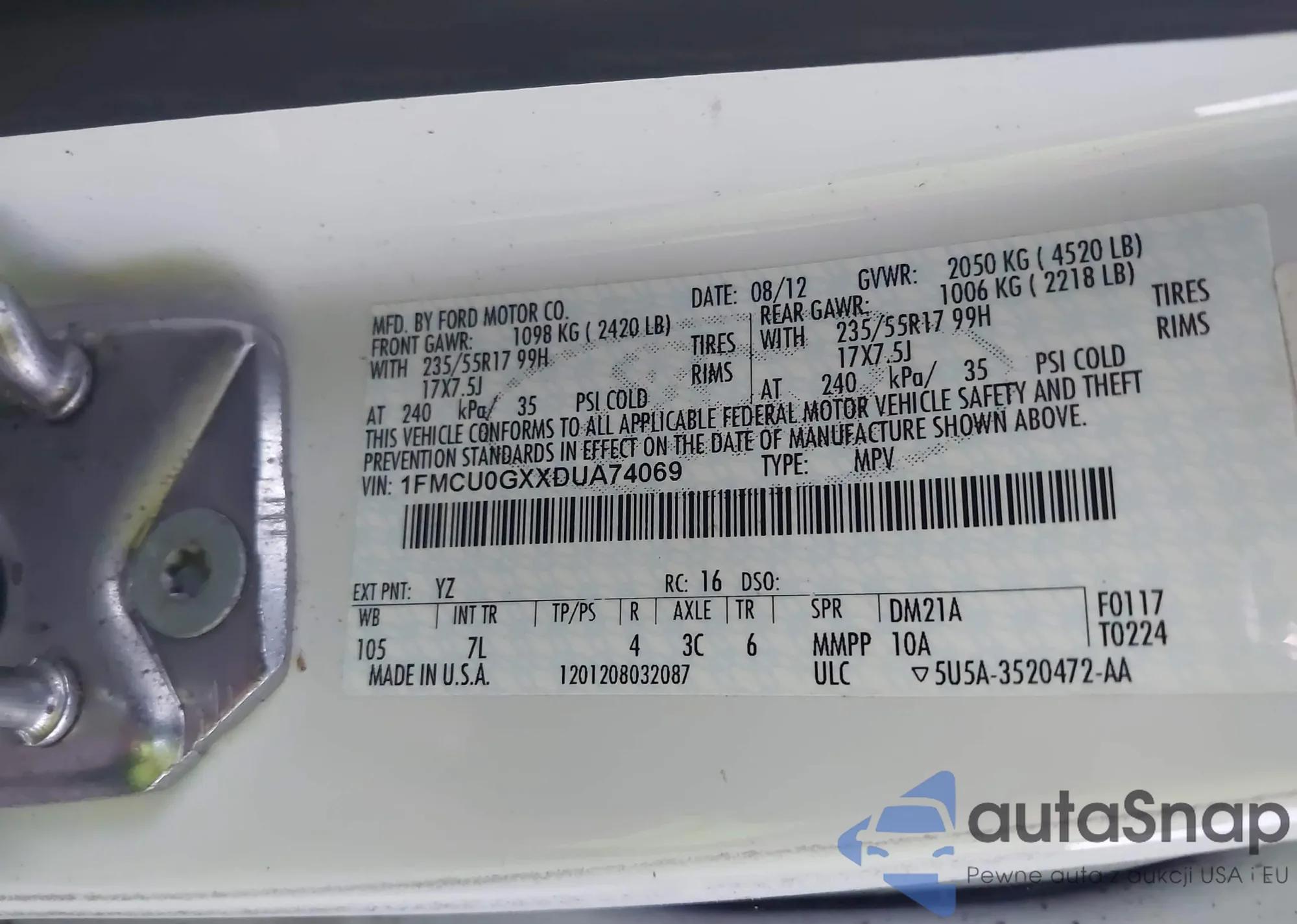 • VIN 1FMCU0GXXDUA74069