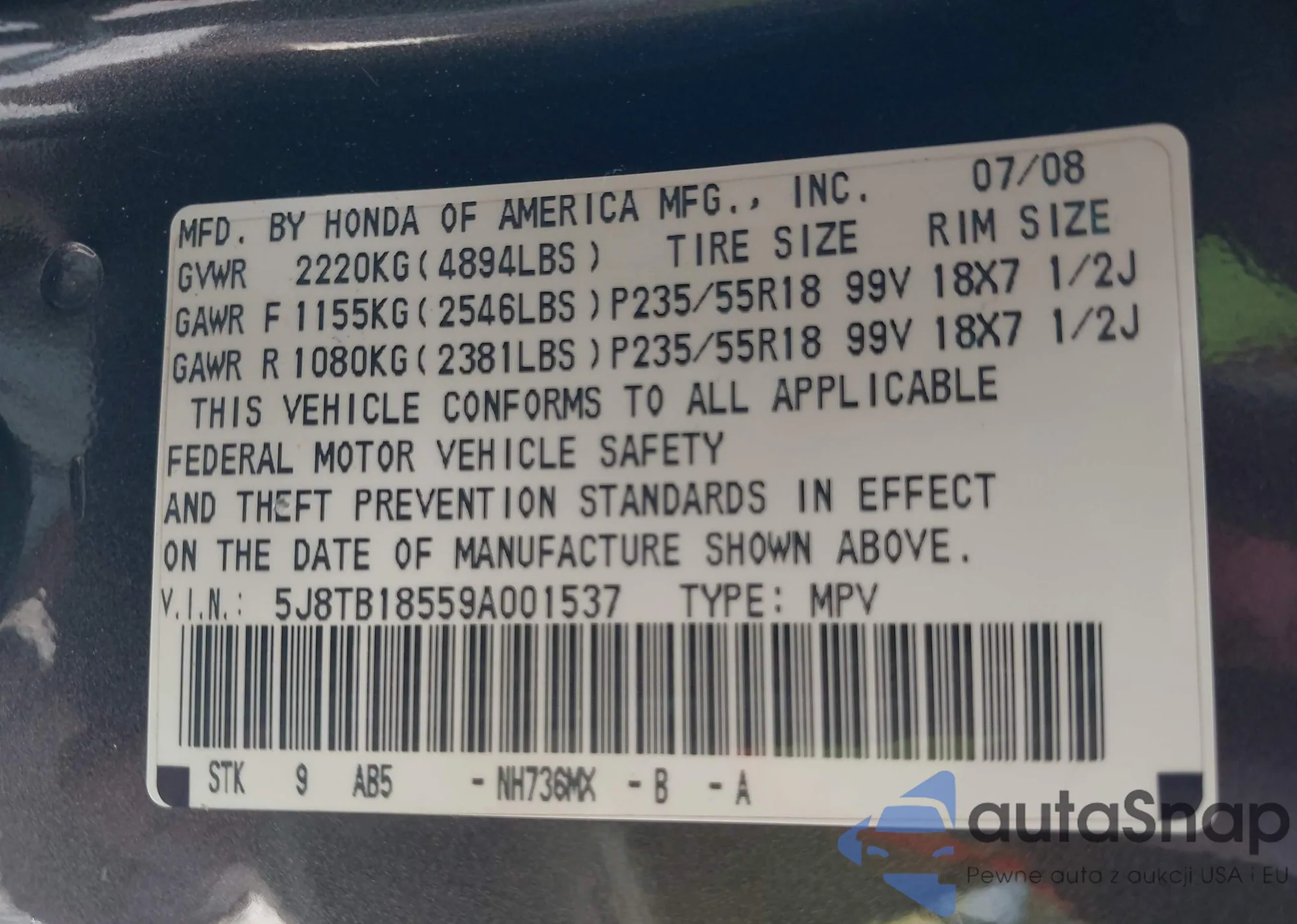 LOT: 43308412 VIN: 5J8TB18559A001537