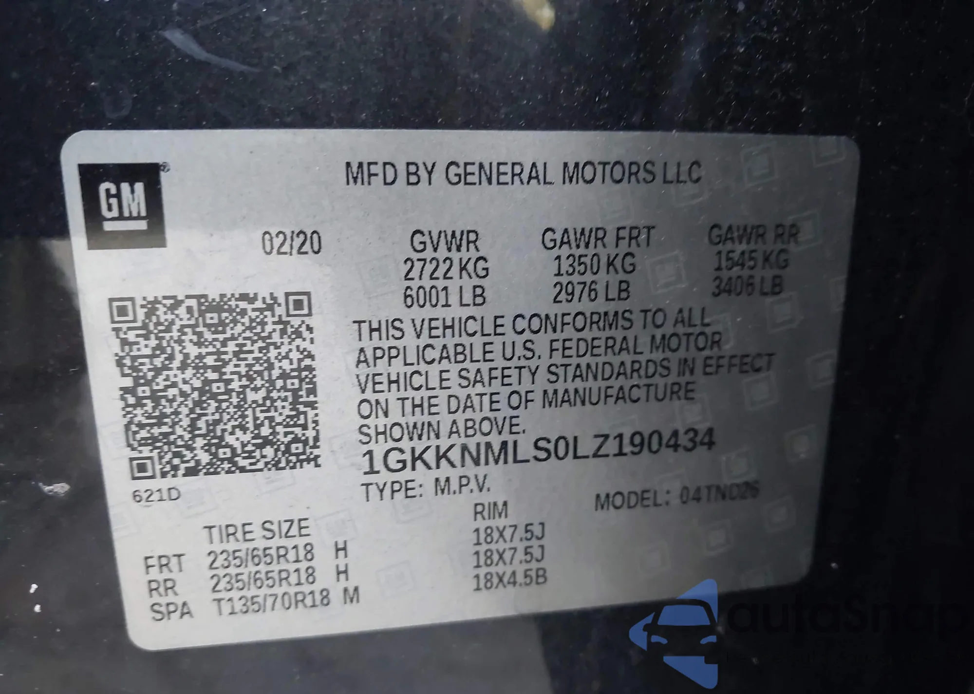 LOT: 43081020 VIN: 1GKKNMLS0LZ190434