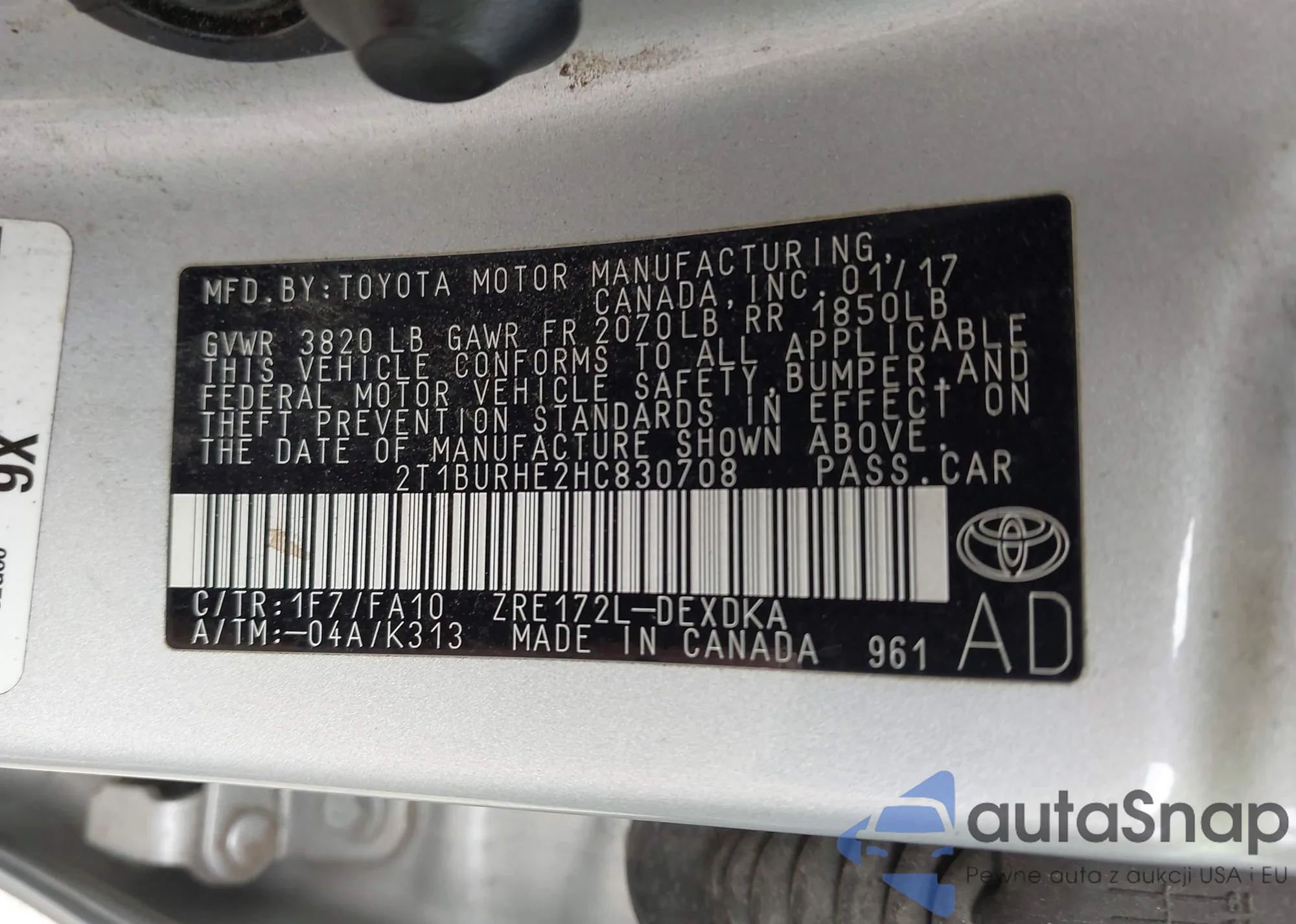 LOT: 43090905 VIN: 2T1BURHE2HC830708