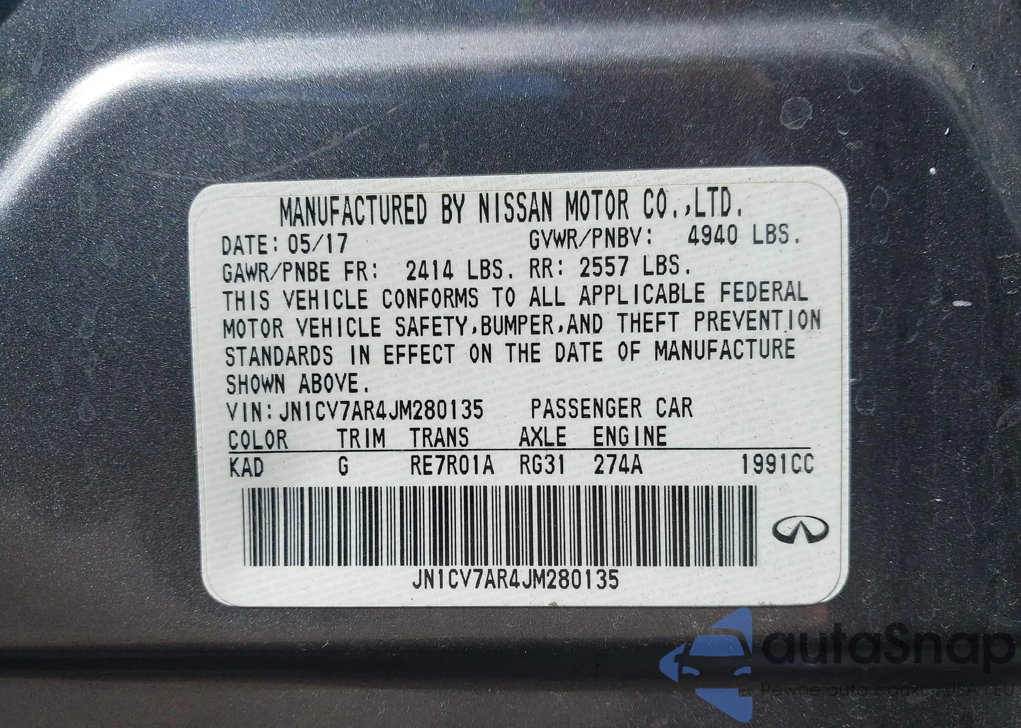 LOT: 43100432 VIN: JN1CV7AR4JM280135