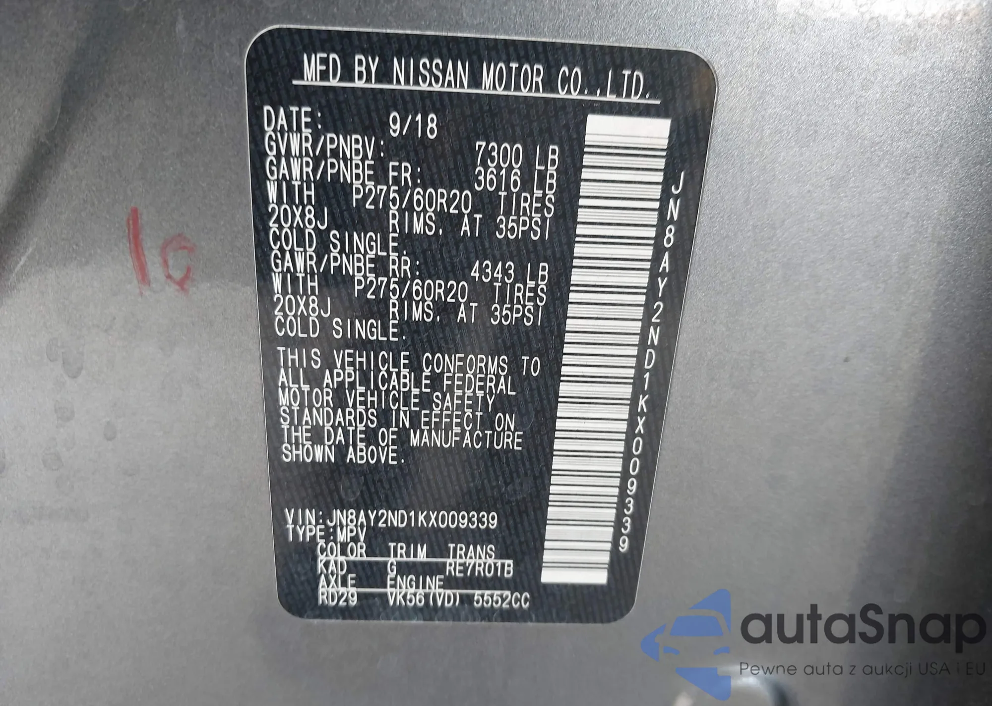 LOT: 43196988 VIN: JN8AY2ND1KX009339
