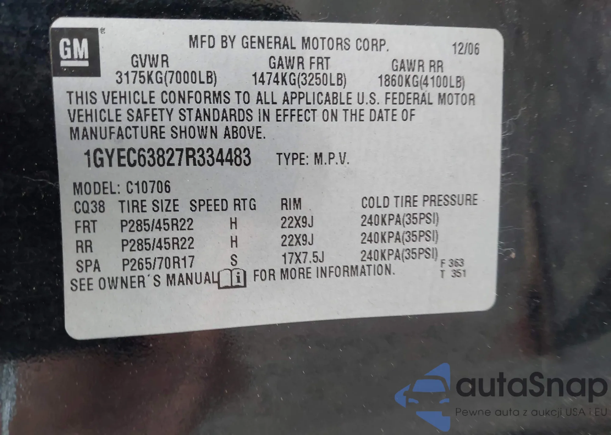 LOT: 43321241 VIN: 1GYEC63827R334483