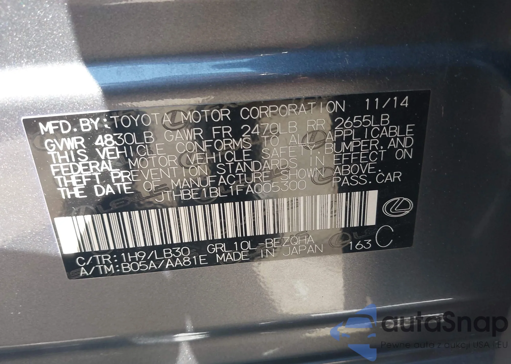 LOT: 43114341 VIN: JTHBE1BL1FA005300