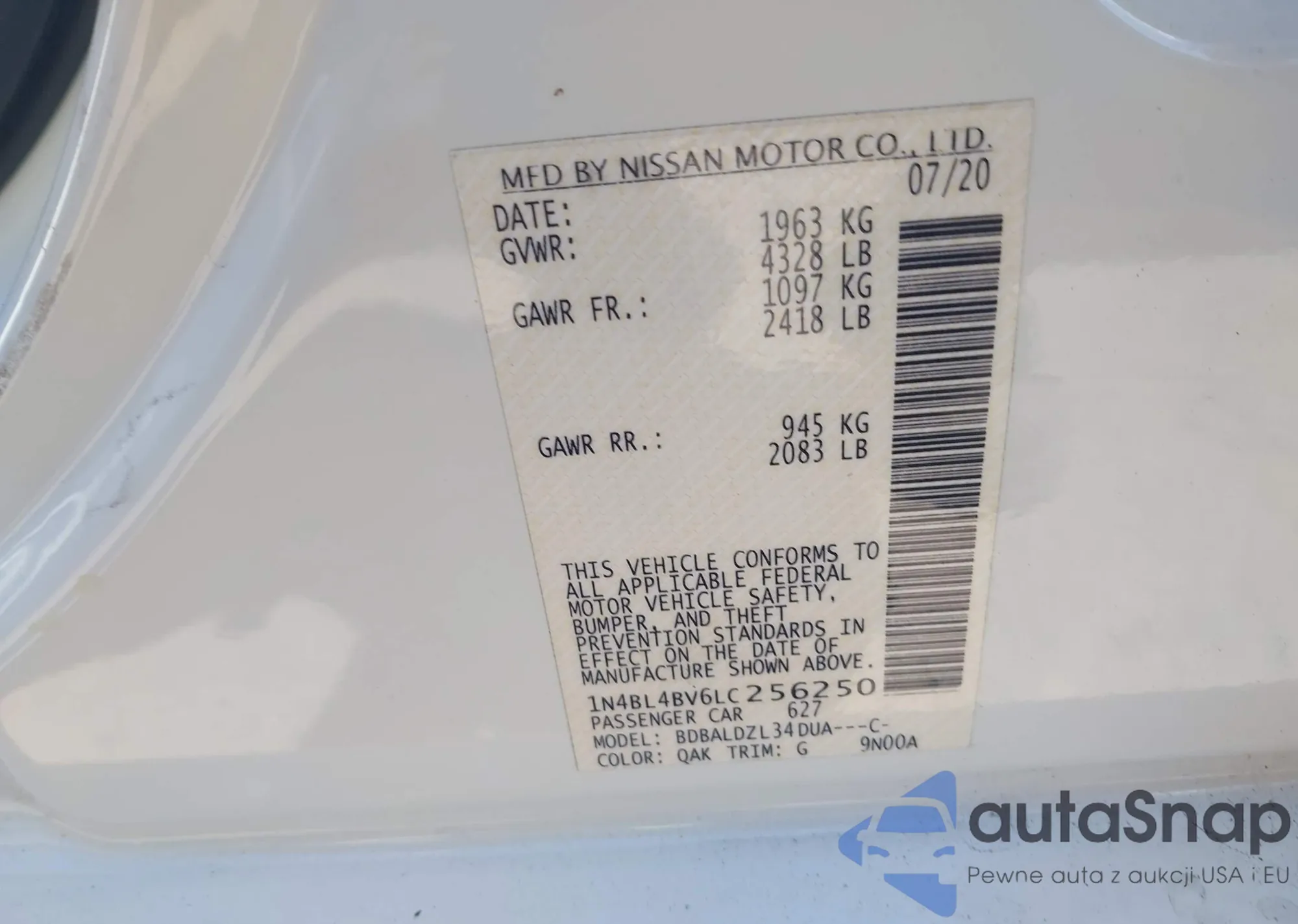 LOT: 43128213 VIN: 1N4BL4BV6LC256250