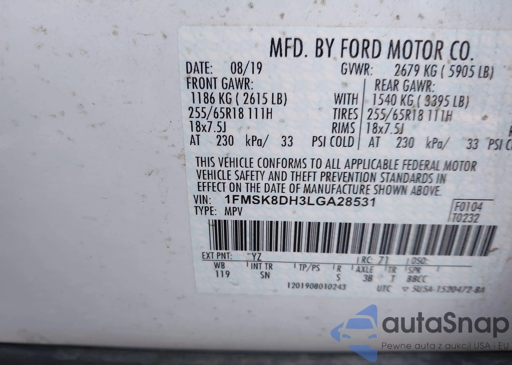 LOT: 43147792 VIN: 1FMSK8DH3LGA28531