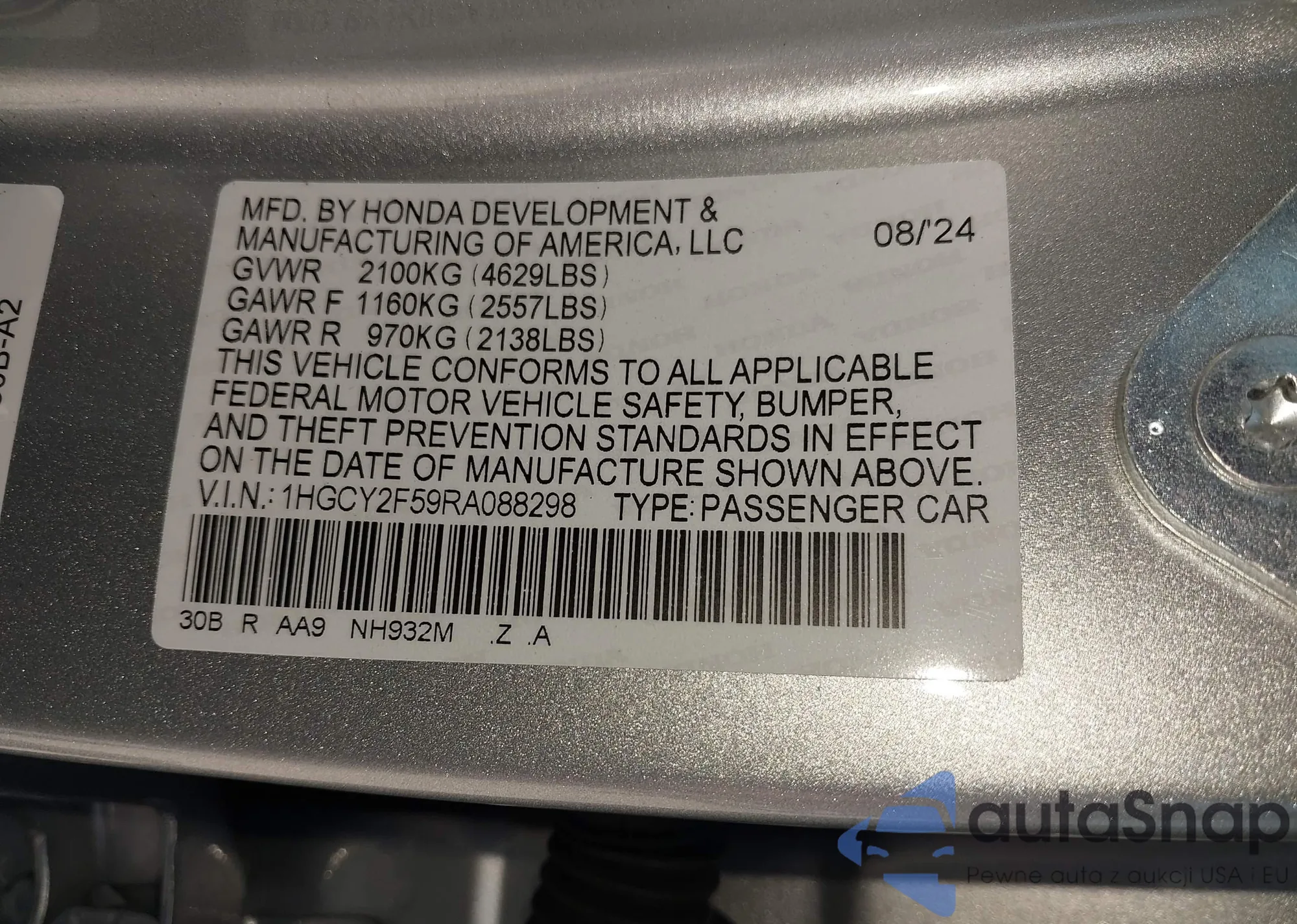 • VIN 1HGCY2F59RA088298
