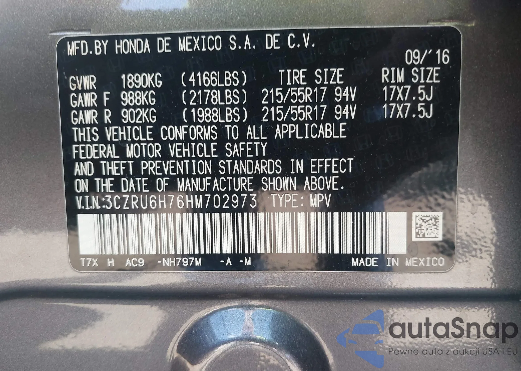 • VIN 3CZRU6H76HM702973