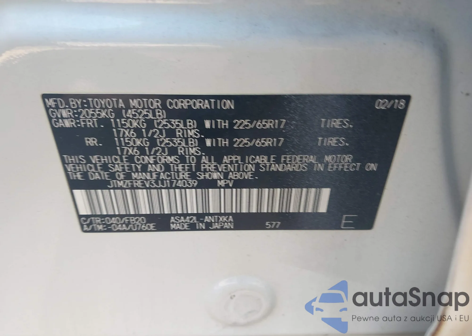 LOT: 43154159 VIN: JTMZFREV3JJ174039