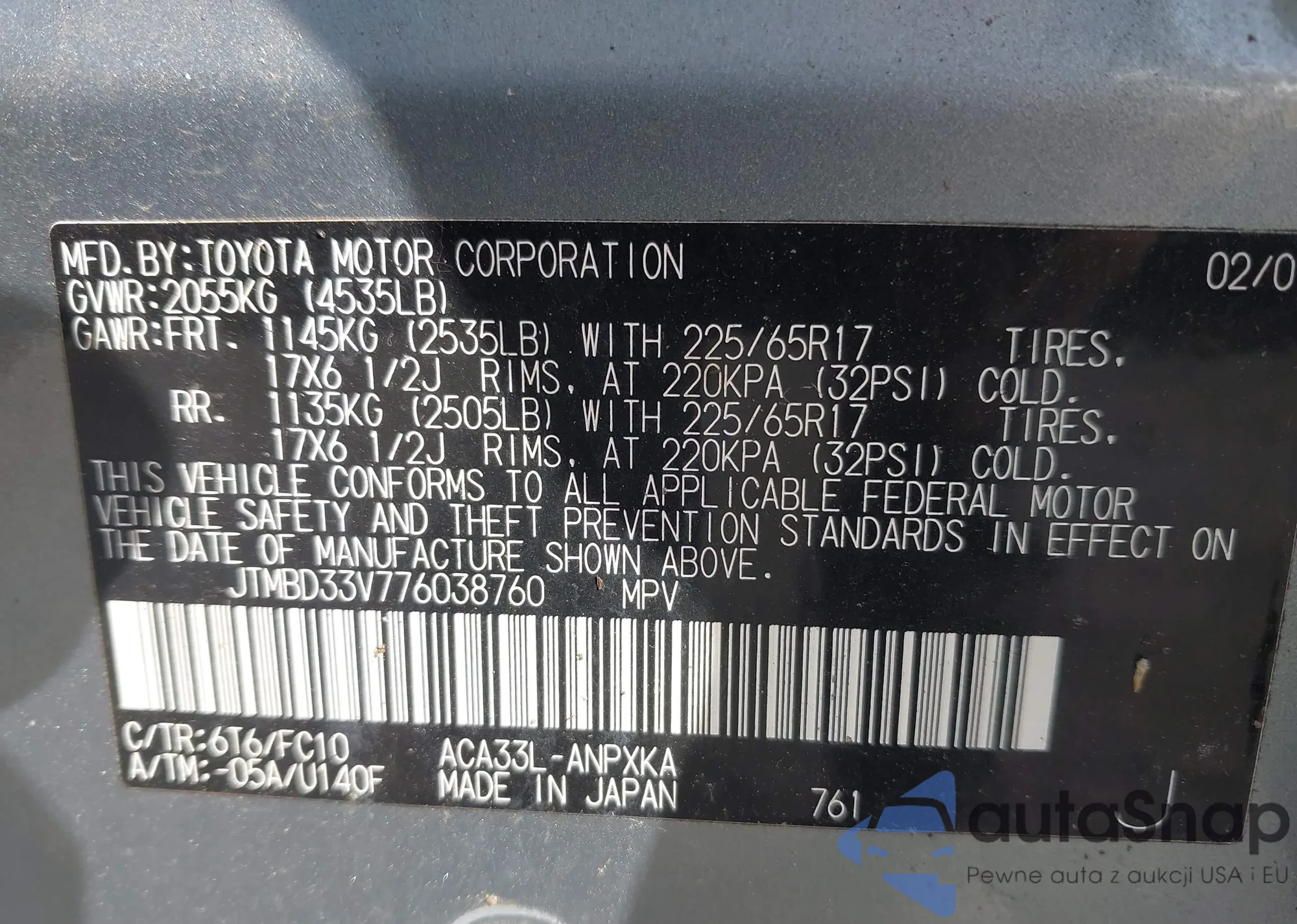 LOT: 43189956 VIN: JTMBD33V776038760