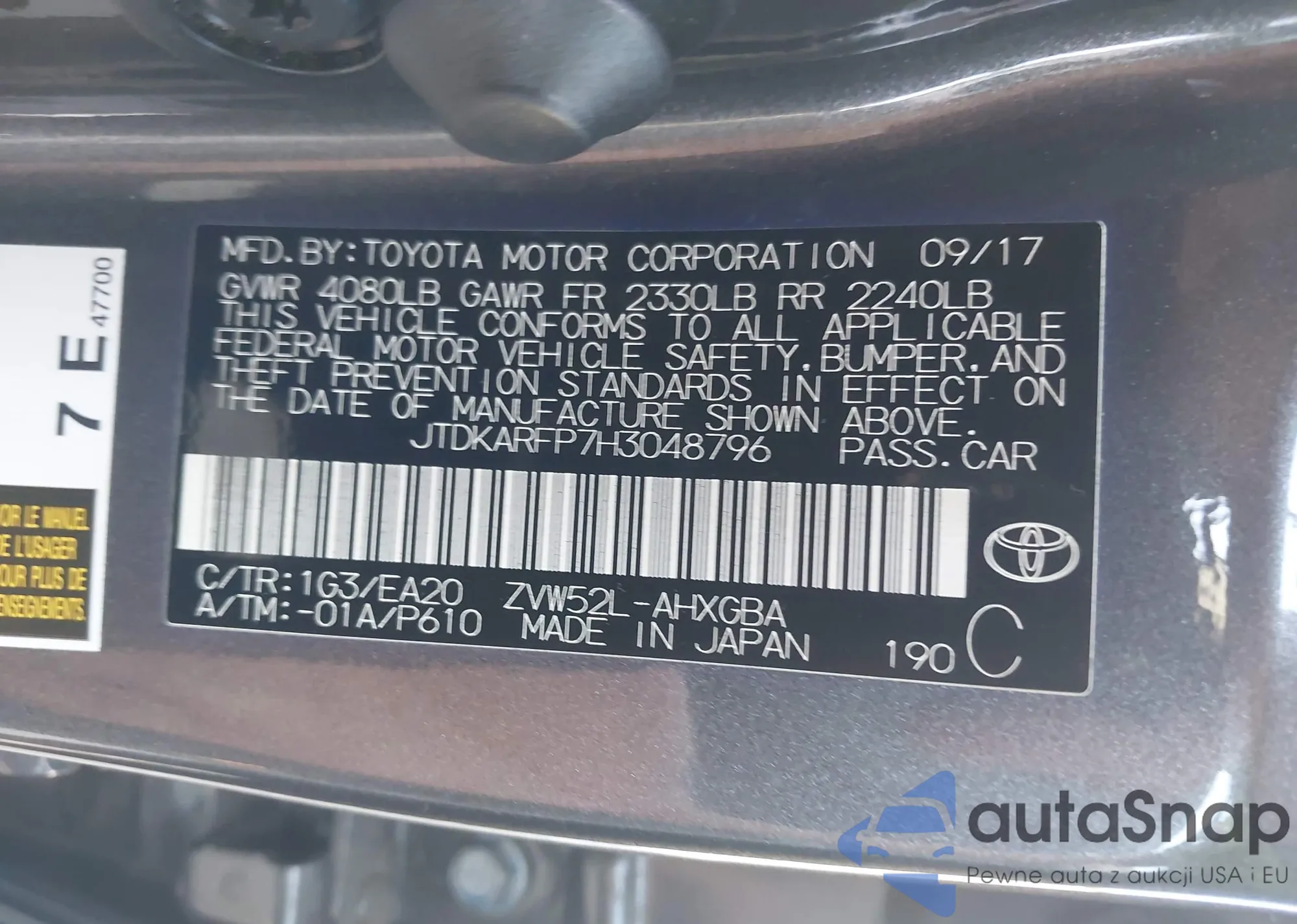 LOT: 43241192 VIN: JTDKARFP7H3048796