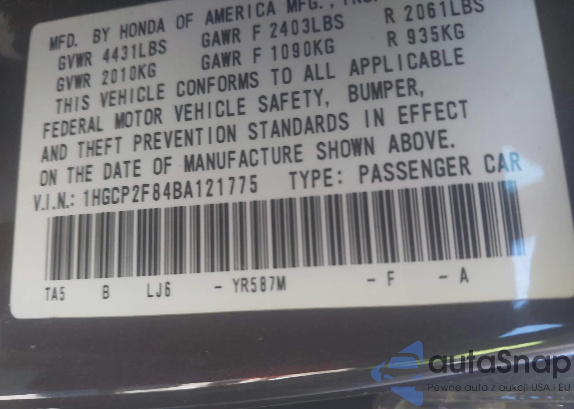 LOT: 43372894 VIN: 1HGCP2F84BA121775