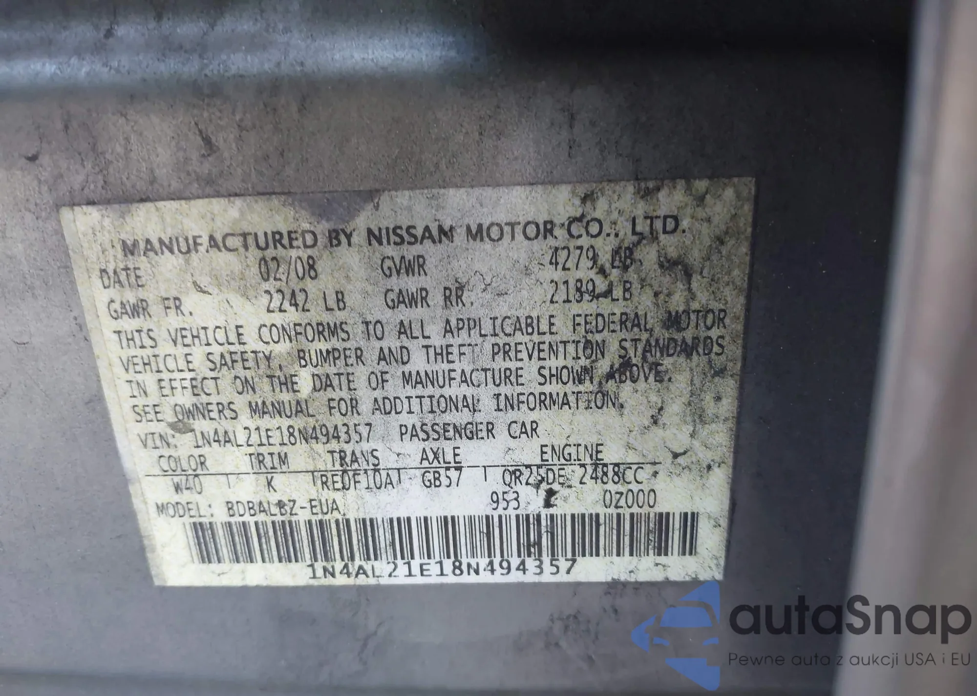 LOT: 43286109 VIN: 1N4AL21E18N494357