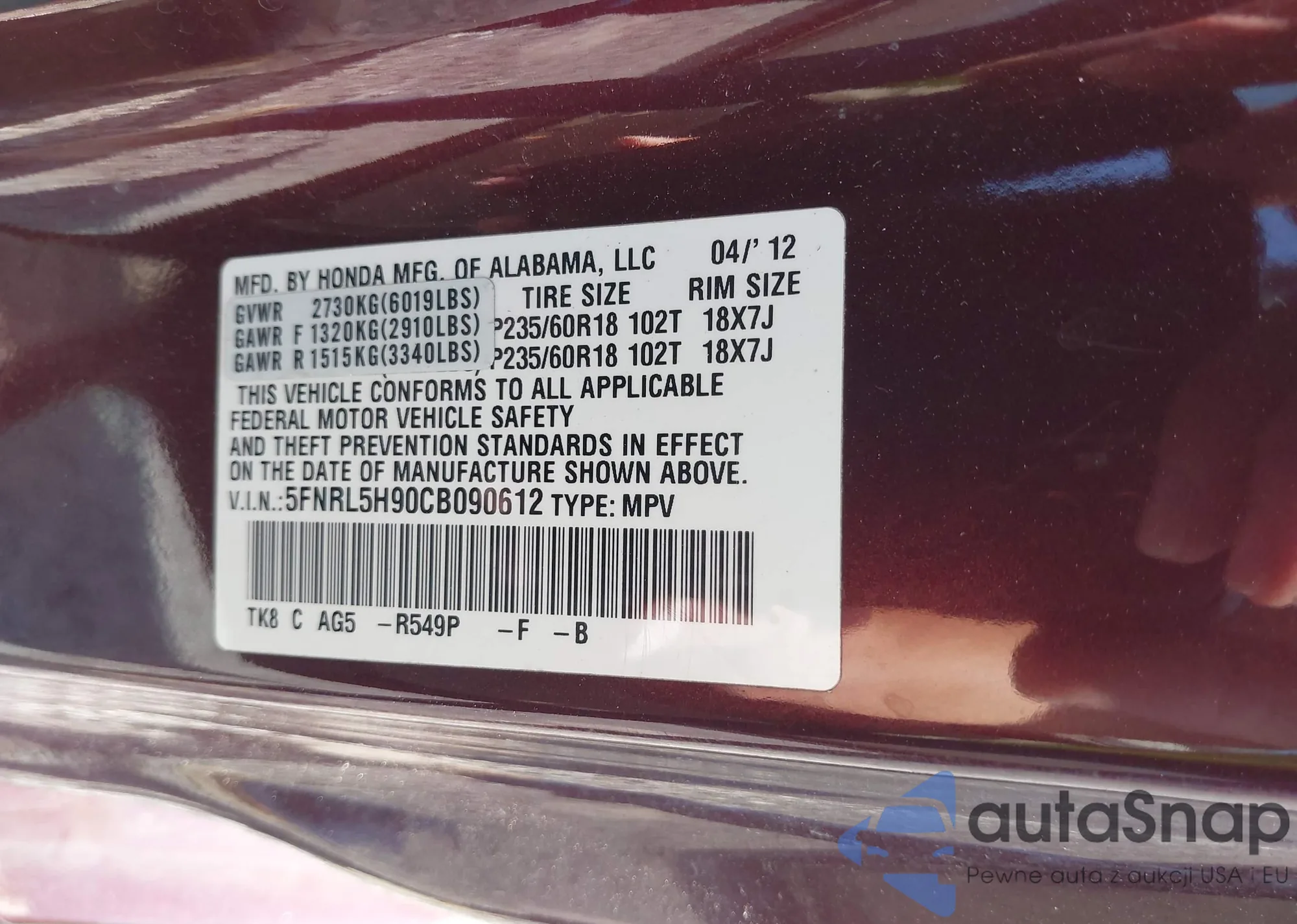 • VIN 5FNRL5H90CB090612