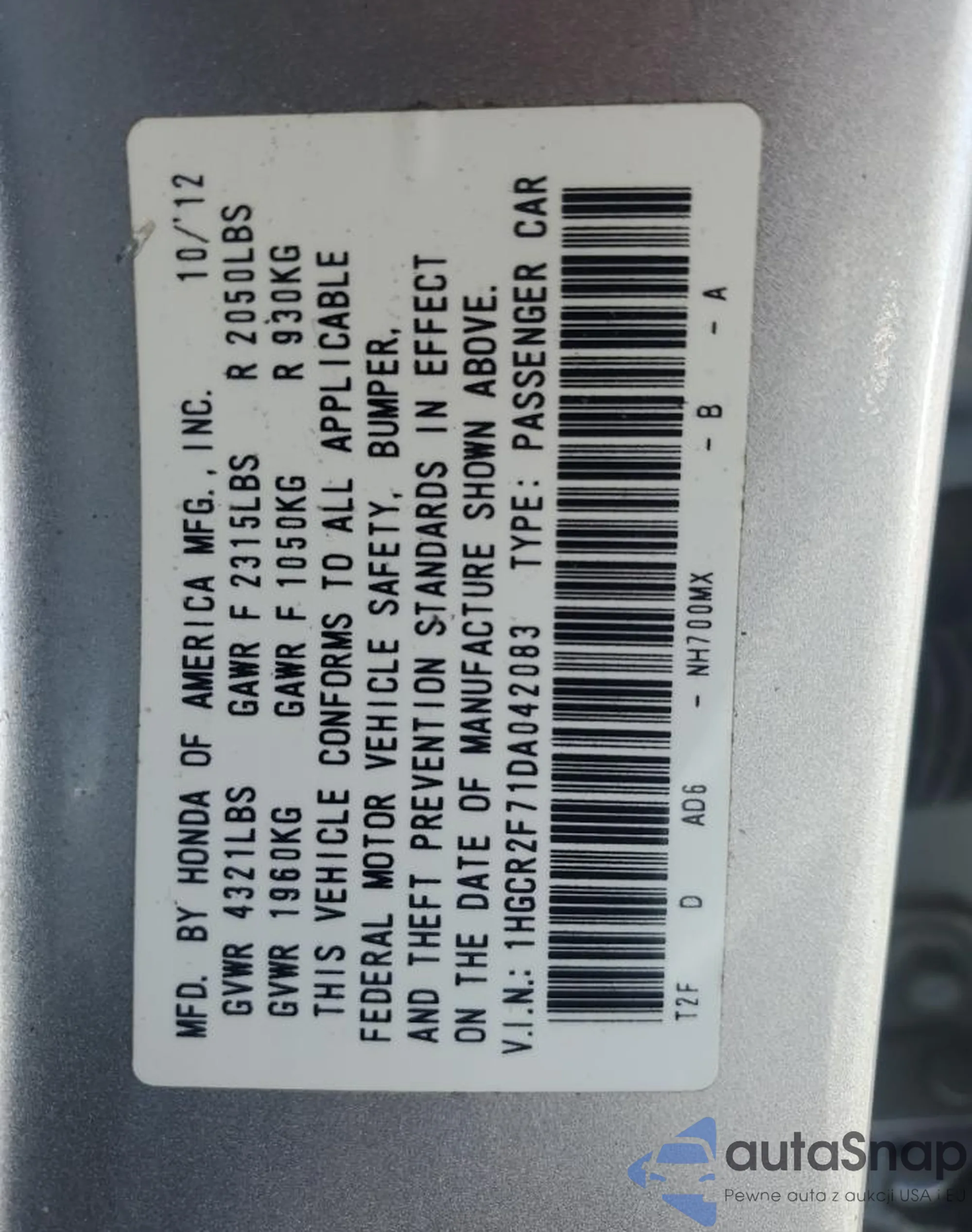 • VIN 1HGCR2F71DA042083