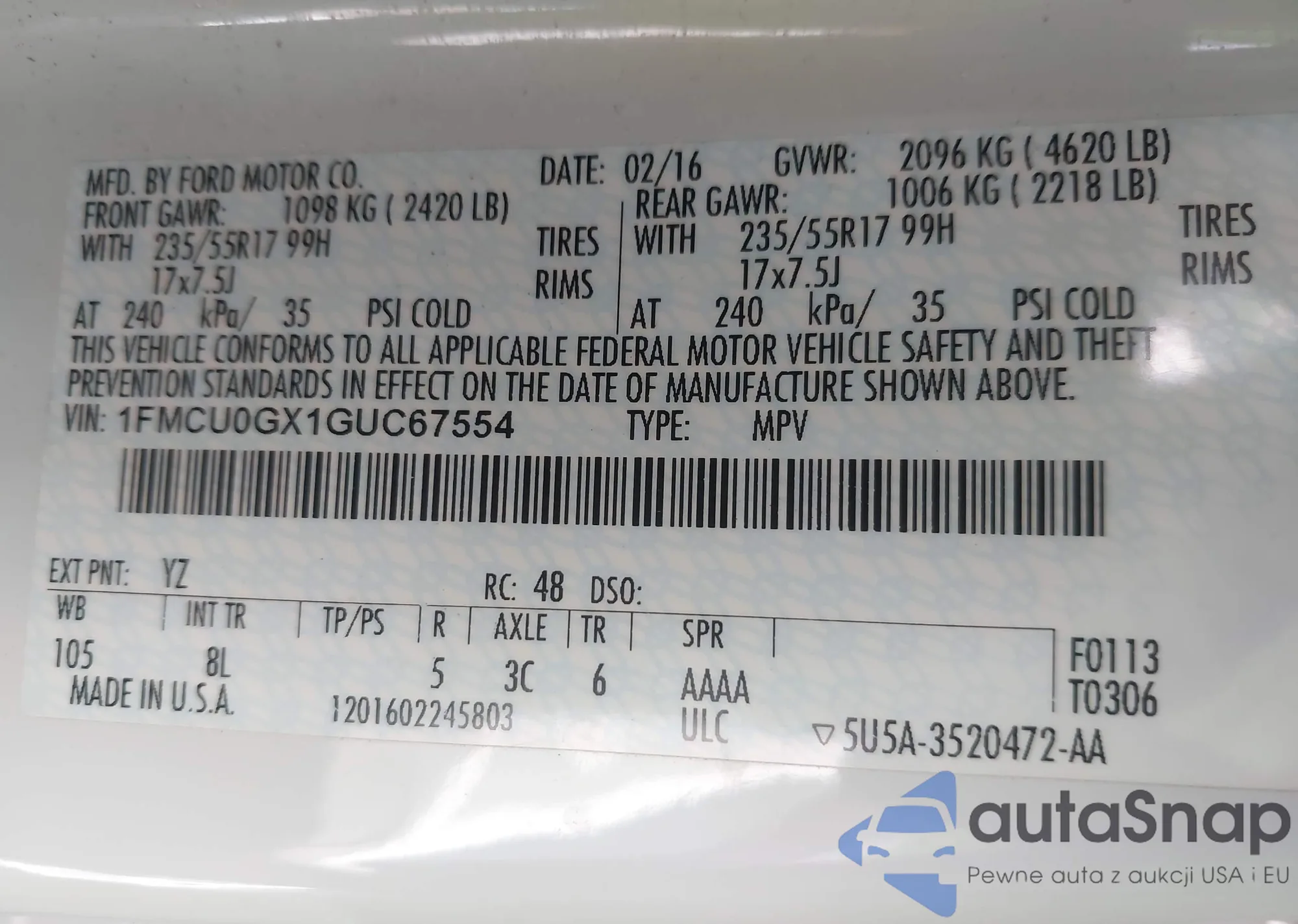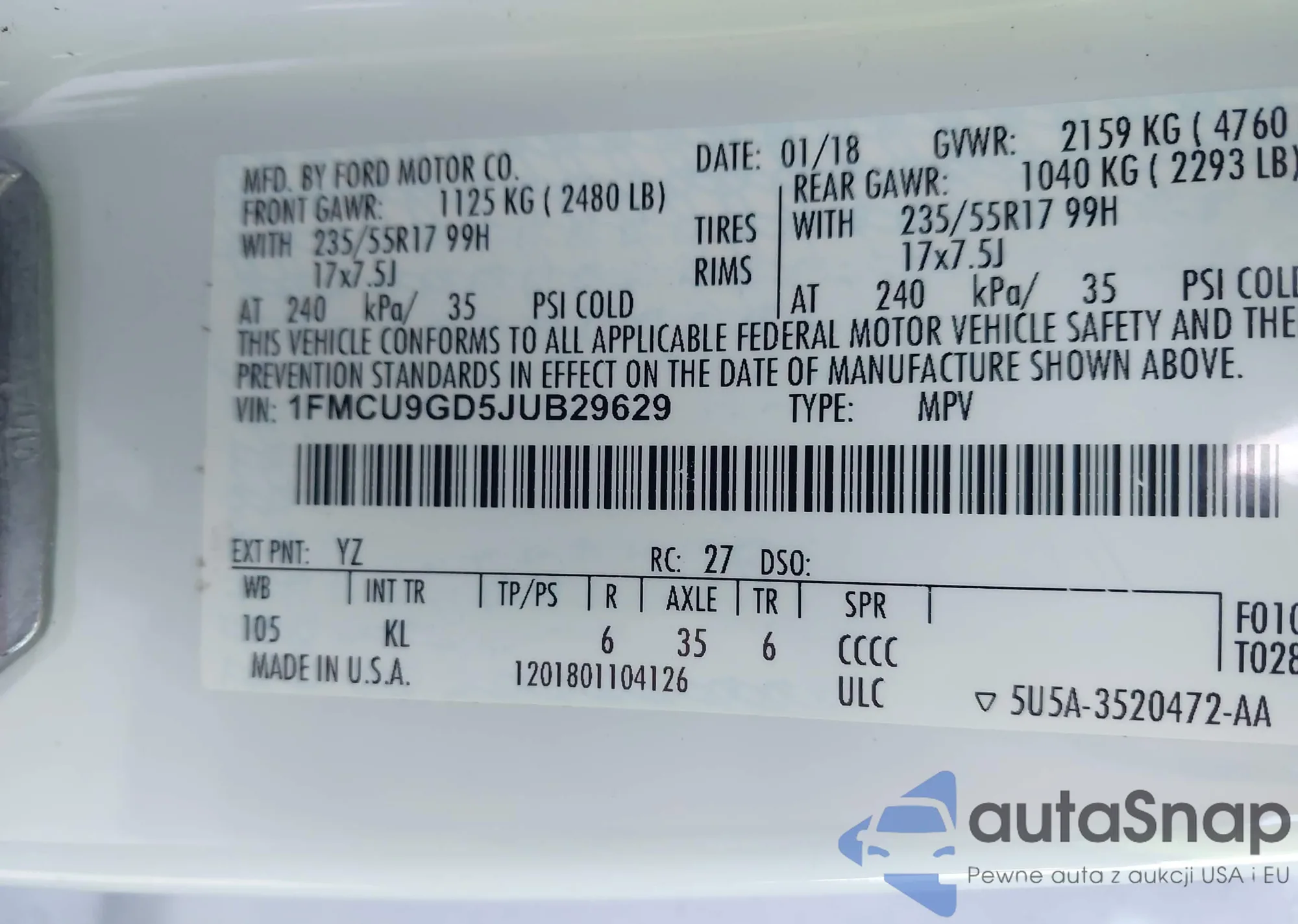 • VIN 1FMCU9GD5JUB29629
