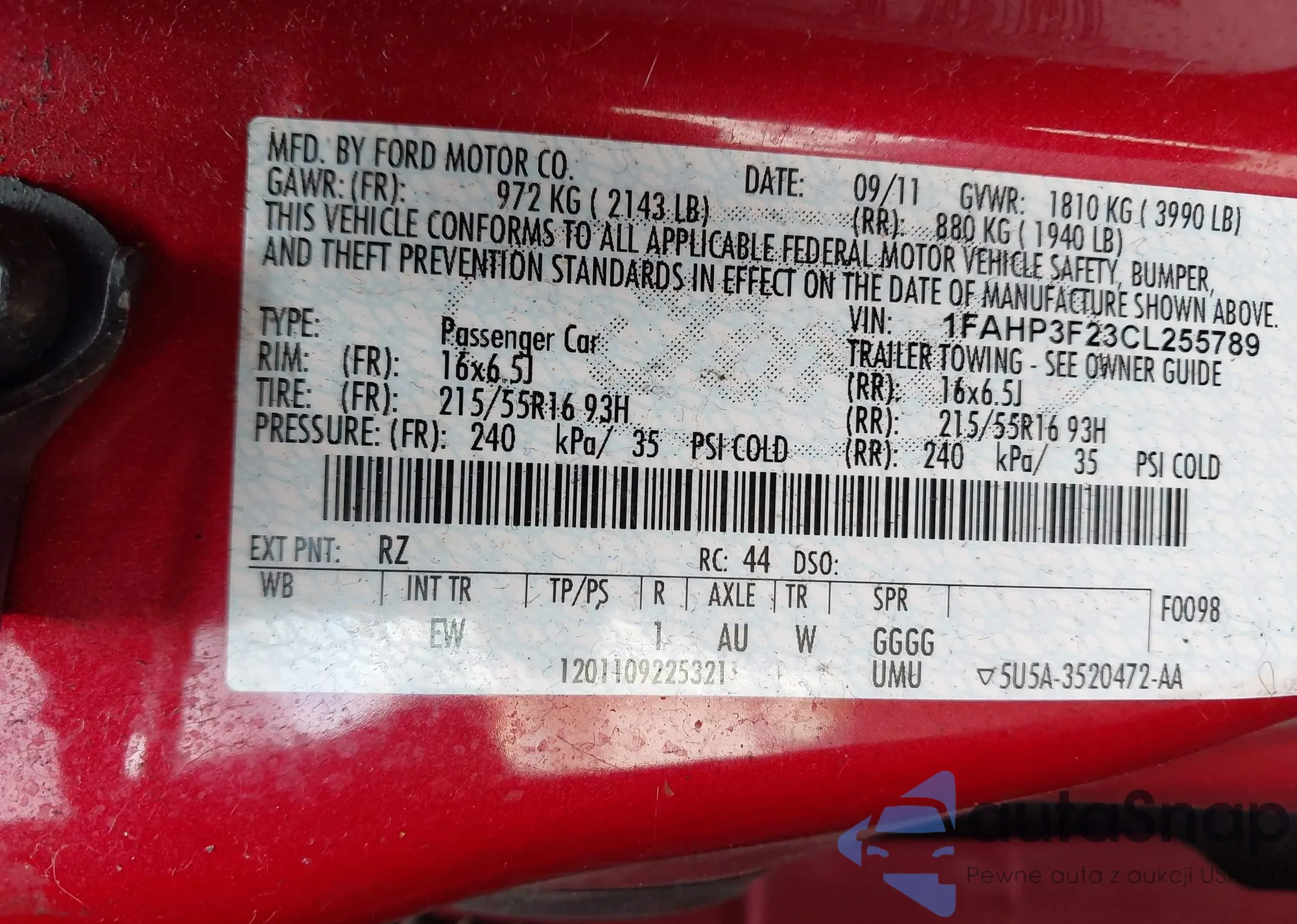 LOT: 43294610 VIN: 1FAHP3F23CL255789